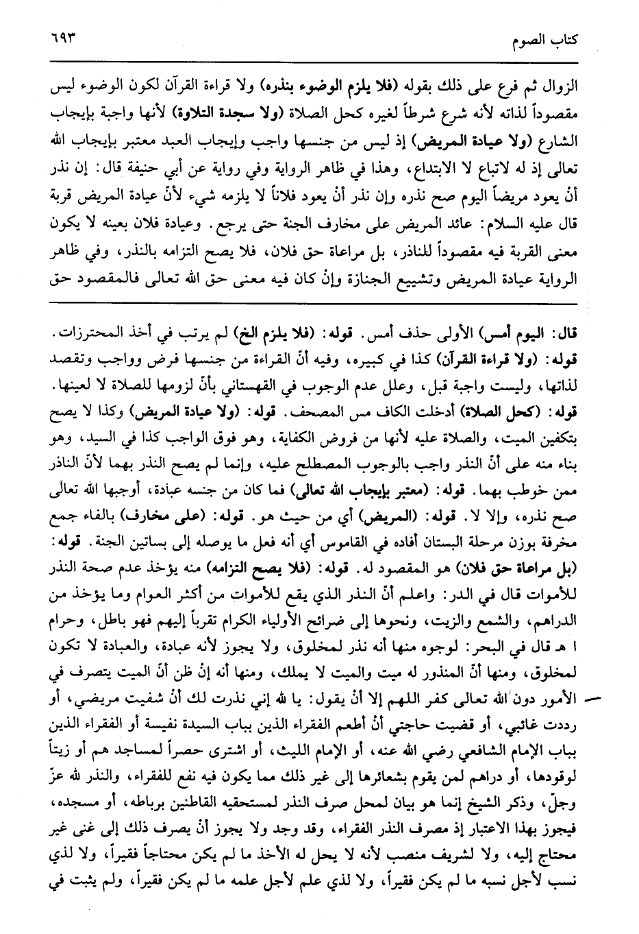 قال اليوم أمس" الأولى حذف أمس قوله: "فلا يلزم الخ" لم يرتب في أخذ المحترزات قوله: "ولا قراءة القرآن" كذا في كبيره وفيه أن القراءة من جنسها فرض وواجب وتقصد لذاتها وليست واجبة قبل وعلل عدم الوجوب في القهستاني بأن لزومها للصلاة لا لعينها قوله: "كحل الصلاة" أدخلت الكاف مس المصحف قوله: "ولا عيادة المريض" وكذا لا يصح بتكفين الميت والصلاة عليه لأنها من فروض الكفاية وهو فوق الواجب كذا في السيد وهو بناء منه على أن النذر واجب بالوجوب المصطلح عليه وإنما لم يصح النذر بهما لأن الناذر ممن خوطب بهما قوله: "معتبر بإيجاب الله تعالى" فما كان من جنسه عبادة أوجبها الله تعالى صح نذره وإلا لا قوله: "المريض" أي من حيث هو قوله: "على مخارف" بالفاء جمع مخرفة بوزن مرحلة البستان أفاده في القاموس أي أنه فعل ما يوصله إلى بساتين الجنة قوله: "بل مراعاة حق فلان" هو المقصود له قوله: "فلا يصح التزامه" منه يؤخذ عدم صحة النذر للأموات قال في الدر واعلم أن النذر الذي يقع للأموات من أكثر العوام وما يؤخذ من الدراهم والشمع والزيت ونحوها إلى ضرائح الأولياء الكرام تقربا إليهم فهو باطل وحرام اهـ قال في البحر لوجوه منها أنه نذر لمخلوق ولا يجوز لأنه عبادة والعبادة لا تكون لمخلوق ومنها أن المنذور له ميت والميت لا يملك ومنها أنه إن ظن أن الميت يتصرف في الأمور دون الله تعالى كفر اللهم إلا أن يقول يا لله إني نذرت لك أن شفيت مريضي أو رددت غائبي أو قضيت حاجتي أن أطعم الفقراء الذين بباب السيدة نفيسة أو الفقراء الذين بباب الإمام الشافعي رضي الله عنه أو الإمام الليث أو اشترى حصرا لمساجد هم أو زيتا لوقودها أو دراهم لمن يقوم بشعائرها إلى غير ذلك مما يكون فيه نفع للفقراء والنذر لله عز وجل وذكر الشيخ إنما هو بيان لمحل صرف النذر لمستحقيه القاطنين برباطه أو مسجده فيجوز بهذا الاعتبار إذ مصرف النذر الفقراء وقد وجد ولا يجوز أن يصرف ذلك إلى غنى غير محتاج إليه ولا لشريف منصب لأنه لا يحل له الأخذ ما لم يكن محتاجا فقيرا ولا لذي نسب لأجل نسبه ما لم يكن فقيرا ولا لذي علم لأجل علمه ما لم يكن فقيرا ولم يثبت في