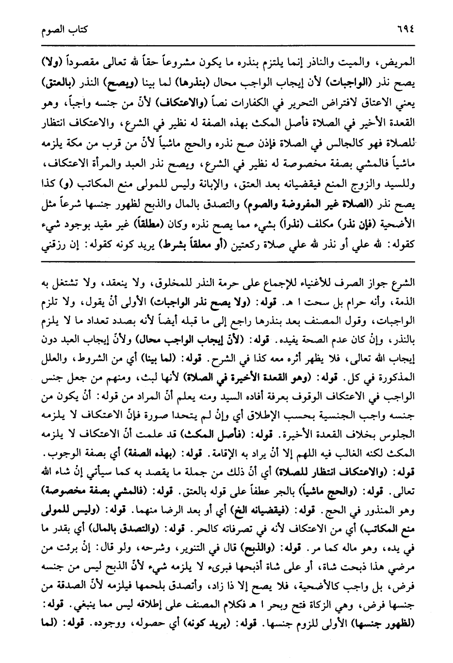 المريض والميت والناذر إنما يلتزم بنذره ما يكون مشروعا حقا لله تعالى مقصودا "ولا" يصح نذر "الواجبات" لأن إيجاب الواجب محال "بنذرها" لما بينا "ويصح" النذر "بالعتق" يعني الإعتاق لافتراض التحرير في الكفارات نصا "والاعتكاف" لأن من جنسه واجبا وهو القعدة الأخيرة في الصلاة فأصل المكث بهذه الصفة له نظير في الشرع والاعتكاف انتظار الصلاة فهو كالجالس في الصلاة فلذا صح نذره والحج ماشيا من قرب من مكة يلزمه ماشيا فالمشي بصفة مخصوصة له نظير في الشرع ويصح نذر العبد والمرأة الاعتكاف وللسيد والزوج المنع فيقضيانه بعد العتق والإبانة وليس للمولى منع المكاتب "و" وكذا يصح نذر "الصلاة غير المفروضة والصوم" والتصدق بالمال والذبح لظهور جنسها شرعا مثل الأضحية "فإن نذر" مكلف "نذرا" بشيء مما يصح نذره وكان "مطلقا" غير مقيد بوجود شيء كقوله لله علي أو أنذر لله علي صلاة ركعتين "أو معلقا بشرط" يريد كونه كقوله له إن رزقني