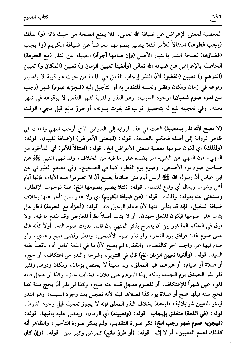 المعصية لمعنى الإعراض عن ضيافة الله تعالى فلا يمنع الصحة من حيث ذاته "و" لذلك "يجب فطرها" امتثالا للأمر لئلا يصير بصومها معرضا عن ضيافة الكريم "و" يجب "قضاؤها" لصحة النذر باعتبار الأصل "وإن صامها أجزأه" الصيام عن النذر "مع الحرمة" الحاصلة بالإعراض عن ضيافة الله تعالى "وألغينا تعيين الزمان و" تعيين "المكان و" تعيين "الدرهم و" تعيين "الفقير" لأن النذر إيجاب الفعل في الذمة من حيث هو قربة لا باعتبار وقوعه في زمان ومكان وفقير وتعيينه للتقدير به أو التأجيل إليه "فيجزئه صوم" شهر "رجب عن نذره صوم شعبان" لوجود السبب وهو النذر والقربة لقهر النفس لا بوقوعه في شهر بعينه وفي تعجيله نفع له بتحصيل ثواب قد يفوت بموته أو طروء مانع قبل مجيء الوقت