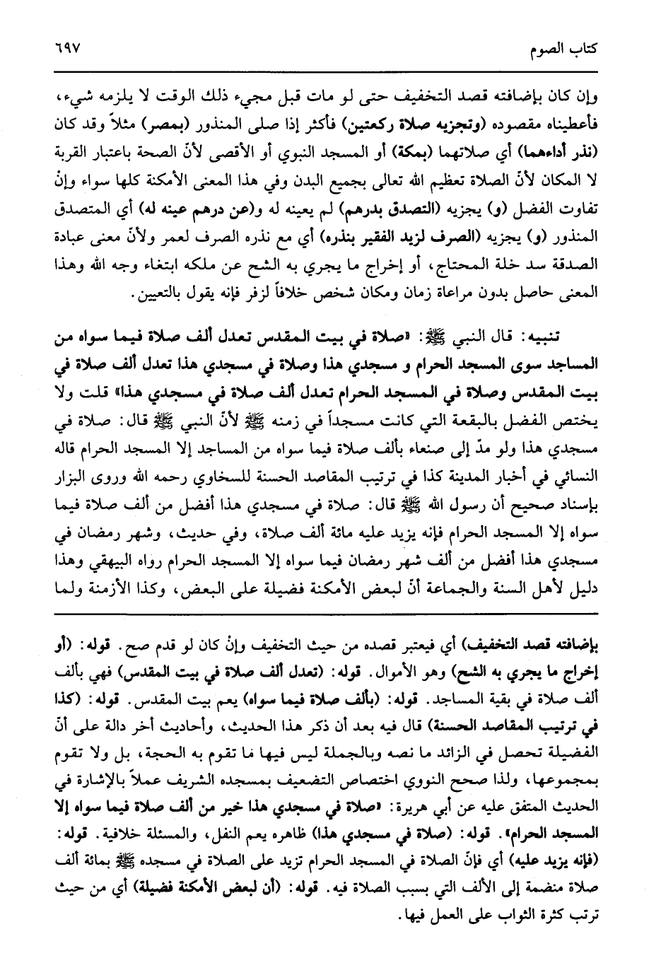 بإضافته قصد التخفيف" أي فيعتبر قصده من حيث التخفيف وإن كان لو قدم صح قوله: "أو إخراج ما يجري به الشح" وهو الأموال قوله: "تعدل ألف صلاة في بيت المقدس" فهي بألف ألف صلاة في بقية المساجد قوله: "بألف صلاة فيما سواه" يعم بيت المقدس قوله: "كذا في ترتيب المقاصد الحسنة" قال فيه بعد أن ذكر هذا الحديث وأحاديث أخر دالة على أن الفضيلة تحصل في الزائد ما نصه وبالجملة ليس فيها ما تقوم به الحجة بل ولا تقوم بمجموعها ولذا صحح النووي اختصاص التضعيف بمسجده الشريف عملا بالإشارة في الحديث المتفق عليه عن أبي هريرة صلاة في مسجدي هذا خير من ألف صلاة فيما سواه إلا المسجد الحرام قوله: "صلاة في مسجدي هذا" ظاهره يعم النفل والمسئلة خلافية قوله: "فإنه يزيد عليه" أي فإن الصلاة في المسجد الحرام تزيد على الصلاة في مسجده صلى الله عليه وسلم بمائة ألف صلاة منضمة إلى الألف التي بسبب الصلاة فيه قوله: "أن لبعض الأمكنة فضيلة" أي من حيث ترتب كثرة الثواب على العمل فيها