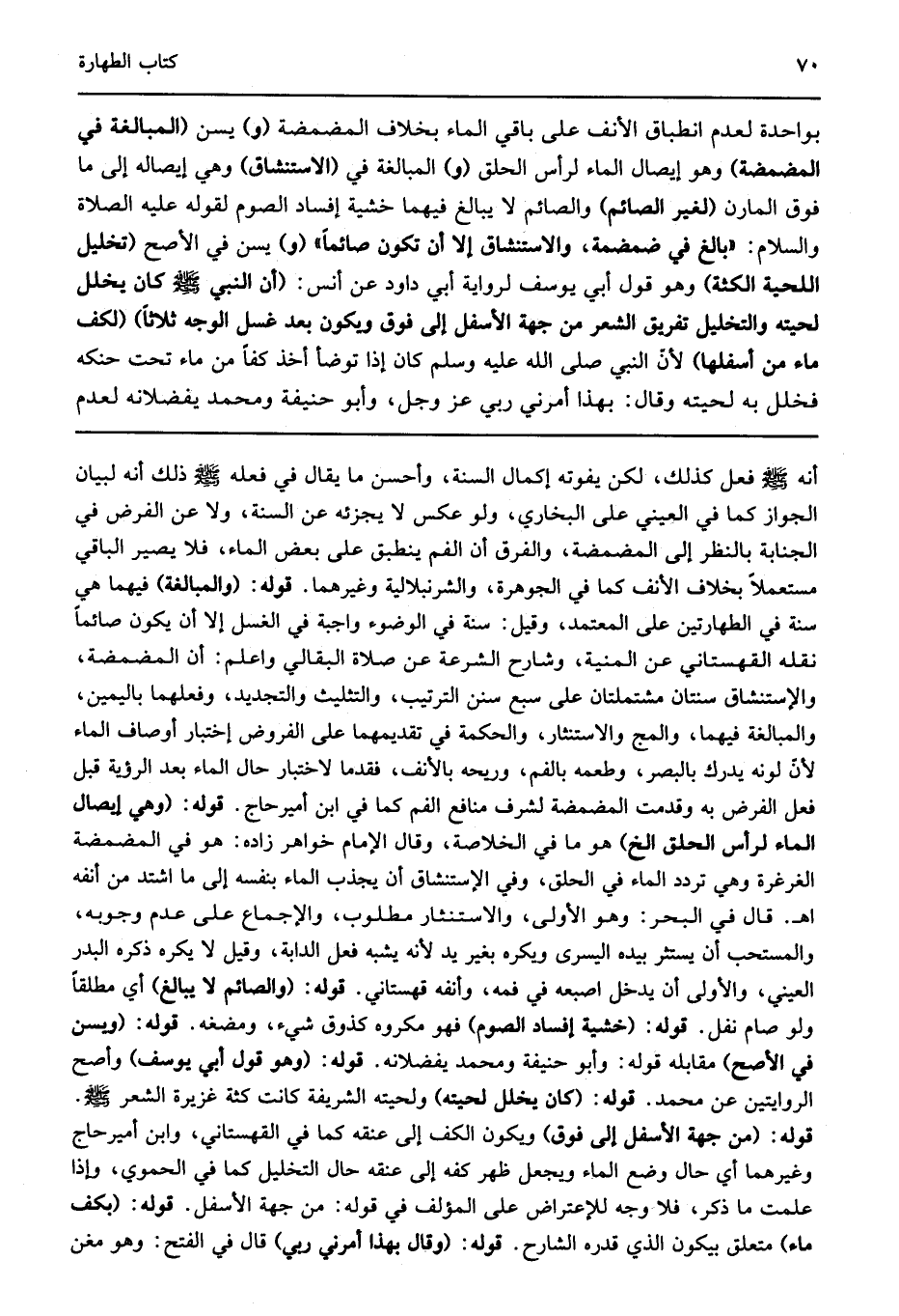 أنه صلى الله عليه وسلم فعل كذلك لكن يفوته إكمال السنة وأحسن ما يقال في فعله صلى الله عليه وسلم ذلك أنه لبيان الجواز كما في العيني على البخاري ولو عكس لا يجزئه عن السنة ولا عن الفرض في الجنابة بالنظر إلى المضمضة والفرق أن الفم ينطبق على بعض الماء فلا يصير الباقي مستعملا بخلاف الأنف كما في الجوهرة والشرنبلالية وغيرهما قوله: "والمبالغة" فيهما هي سنة في الطهارتين على المعتمد وقيل سنة في الوضوء واجبة في الغسل إلا أن يكون صائما نقله القهستاني عن المنية وشارح الشرعة عن صلاة البقالي واعلم أن المضمضة والإستنشاق سنتان مشتملتان على سبع سنن الترتيب والتثليث والتجديد وفعلهما باليمين والمبالغة فيهما والمج والاستنثار والحكمة في تقديمهما على الفروض إختبار أوصاف الماء لأن لونه يدرك بالبصر وطعمه بالفم وريحه بالأنف فقدما لاختبار حال الماء بعد الرؤية قبل فعل الفرض به وقدمت المضمضة لشرف منافع الفم كما في ابن أمير حاج قوله: "وهي إيصال الماء لرأس الحلق الخ" هو ما في الخلاصة وقال الإمام خواهر زاده هو في المضمضة الغرغرة وهي تردد الماء في الحلق وفي الإستنشاق أن يجذب الماء بنفسه إلى ما اشتد من أنفه اهـ قال في البحر وهو الأولى والاستنثار مطلوب والإجماع على عدم وجوبه والمستحب أن يستثر بيده اليسرى ويكره بغير يد لأنه يشبه فعل الدابة وقيل لا يكره ذكره البدر العيني والأولى أن يدخل اصبعه في فمه وأنفه قهستاني قوله: "والصائم لا يبالغ" أي مطلقا ولو صام نفل قوله: "خشية إفساد الصوم" فهو مكروه كذوق شيء ومضغه قوله: "ويسن في الأصح" مقابله قوله وأبو حنيفة ومحمد يفضلانه قوله: "وهو قول أبي يوسف" وأصح الروايتين عن محمد قوله: "كان يخلل لحيته" ولحيته الشريفة كانت كثة غزيرة الشعر صلى الله عليه وسلم قوله: "من جهة الأسفل إلى فوق" ويكون الكف إلى عنقه كما في القهستاني وابن أمير حاج وغيرهما أي حال وضع الماء ويجعل ظهر كفه إلى عنقه حال التخليل كما في الحموي وإذا علمت ما ذكر فلا وجه للإعتراض على المؤلف في قوله من جهة الأسفل قوله: "بكف ماء" متعلق بيكون الذي قدره الشارح قوله: "وقال بهذا أمرني ربي" قال في الفتح وهو مغن.