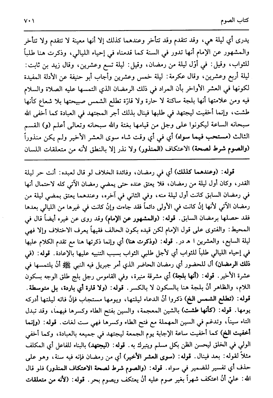 يدري أي ليلة هي وقد تتقدم وقد تتأخر وعندهما كذلك إلا أنه معينة لا تتقدم ولا تتأخر والمشهور عن الإمام أنها تدور في السنة كما قدمناه في إحياء الليالي وذكرت هنا طلبا لزيادة الثواب وقيل في أول ليلة من رمضان وقيل ليلة تسع وعشرين وقال زيد بن ثابت ليلة أربع وعشرين وقال عكرمة ليلة خمس وعشرين. وأجاب أبو حنيفة عن الأدلة المفيدة لكونها في العشر الأواخر بأن المراد في ذلك لرمضان الذي التمسها عليه السلام فيه ومن علامتها أنها بلجة ساكنة لا حارة ولا قارة تطلع الشمس صبيحتها بلا شعاع كأنها طشت وإنما أخفيت ليجتهد في طلبها فينال بذلك أجر المجتهد في العبادة كما أخفى الله سبحانه وتعالى الساعة ليكونوا على وجل من قيامها بغتة والله سبحانه وتعالى أعلم "و" القسم الثالث "مستحب فيما سواه" أي في أي وقت شاء سوى العشر الأخير ولم يكن منذورا "والصوم شرط لصحة" الاعتكاف "المنذور" ولا نذر لأنه من متعلقات اللسان
