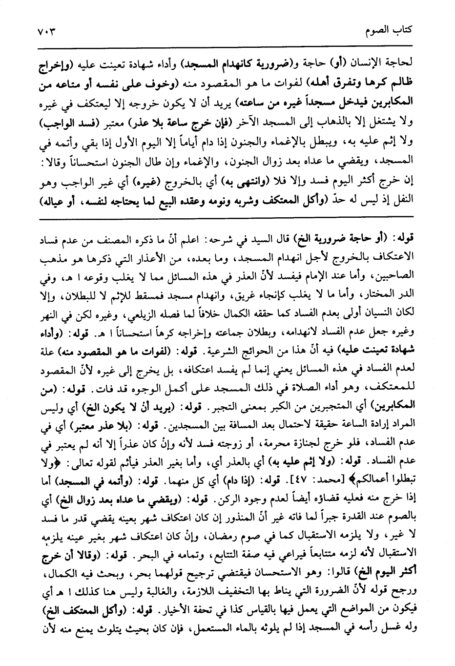 قوله: "أو حاجة ضرورية الخ" قال السيد في شرحه اعلم أن ما ذكره المصنف من عدم فساد الاعتكاف بالخروج لأجل انهدام المسجد وما بعده من الأعذار التي ذكرها هو مذهب الصاحبين وأما عند الإمام فيفسد لأن العذر في هذه المسائل مما لا يغلب وقوعه اهـ وفي الدر المختار وأما ما لا يغلب كإنجاء غريق وانهدام مسجد فمسقط للإثم لا للبطلان وإلا لكان النسيان أولى بعدم الفساد كما حققه الكمال خلافا لما فصله الزيلعي وغيره لكن في النهر وغيره جعل عدم الفساد لانهدامه وبطلان جماعته وإخراجه كرها استحسانا اهـ قوله: "وأداء شهادة تعينت عليه" فيه أن هذا من الحوائج الشرعية قوله: "لفوات ما هو المقصود منه" علة لعدم الفساد في هذه المسائل يعني إنما لم يفسد اعتكافه بل يخرج إلى غيره لأن المقصود للمعتكف وهو أداء الصلاة في ذلك المسجد على أكمل الوجوه قد فات قوله: "من المكابرين" أي المتجبرين من الكبر بمعنى التجبر قوله: "يريد أن لا يكون الخ" أي وليس المراد إرادة الساعة حقيقة لاحتمال بعد المسافة بين المسجدين قوله: "بلا عذر معتبر" أي في عدم الفساد فلو خرج لجنازة محرمة أو زوجته فسد لأنه وإن كان عذرا إلا أنه لم يعتبر في عدم الفساد قوله: "ولا إثم عليه به" أي بالعذر أي وأما بغير العذر فيأثم لقوله تعالى: {وَلا تُبْطِلُوا أَعْمَالَكُمْ} [محمد: 33] قوله: "إذا دام" أي كل منهما قوله: "وأتمه في المسجد" أما إذا خرج منه فعليه قضاؤه أيضا لعدم وجود الركن قوله: "ويقضي ما عداه بعد زوال الخ" أي بالصوم عند القدرة جبرا لما فاته غير أن المنذور إن كان اعتكاف شهر بعينه يقضي قدر ما فسد لا غير ولا يلزمه الاستقبال كما في صوم رمضان وإن كان اعتكاف شهر بغير عينه يلزمه الاستقبال لأنه لزمه متتابعا فيراعي فيه صفة التتابع وتمامه في البحر قوله: "وقالا أن خرج أكثر اليوم الخ" قالوا: وهو الاستحسان فيقتضي ترجيح قولهما بحر وبحث فيه الكمال ورجح قوله لأن الضرورة التي يناط بها التخفيف اللازمة والغالبة وليس هنا كذلك اهـ أي فيكون من المواضع التي يعمل فيها بالقياس كذا في تحفة الأخيار قوله: "وأكل المعتكف الخ" وله غسل رأسه في المسجد إذا لم يلوثه بالماء المستعمل فإن كان بحيث يتلوث يمنع منه لأن