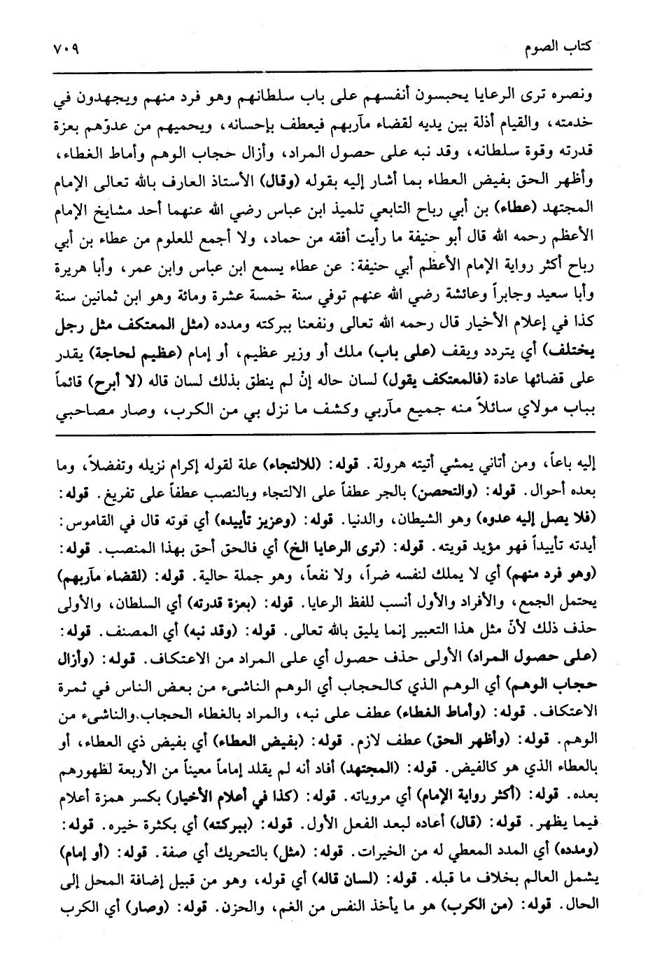 ونصره ترى الرعايا يحبسون أنفسهم على باب سلطانهم وهو فرد منهم ويجهدون في خدمته والقيام أذلة بين يديه لقضاء مآربهم فيعطف عليهم بإحسانه ويحميهم من عدوهم بعزة قدرته وقوة سلطانه وقد نبهه على حصول المراد وأزال حجاب الوهم وأماط الغطاء وأظهر الحق لما أشار إليه بقوله "وقال" الأستاذ العارف بالله تعالى الإمام المجتهد "عطاء" بن أبي رباح التابعي تلميذ ابن عباس رضي الله عنهما أحد مشايخ الإمام الأعظم رحمه الله تعالى قال أبو حنيفة ما رأيت أفقه من حماد ولا أجمع للعلم من عطاء ابن أبي رباح أكثر رواية الإمام الأعظم أبي حنيفة عن عطاء سمع ابن عباس وابن عمر وأبا هريرة وأبا سعيد وجابرا وعائشة رضي الله عنهم توفي سنة خمس عشرة ومائة وهو ابن ثمانين سنة كذا في أعلام الأخبار قال رحمه الله تعالى ونفعنا ببركته ومدده "مثل المعتكف مثل رجل يختلف" أي يتردد ويقف "على باب" ملك أو وزير عظيم أو "إمام لحاجة" يقدر على قضائها عادة "فالمعتكف يقول" لسان حاله إن لم ينطق بذلك لسان قاله "لا أبرح" قائما بباب مولاي سائلا منه جميع مآربي وكشف ما نزل بي من الكرب وصار مصاحبي