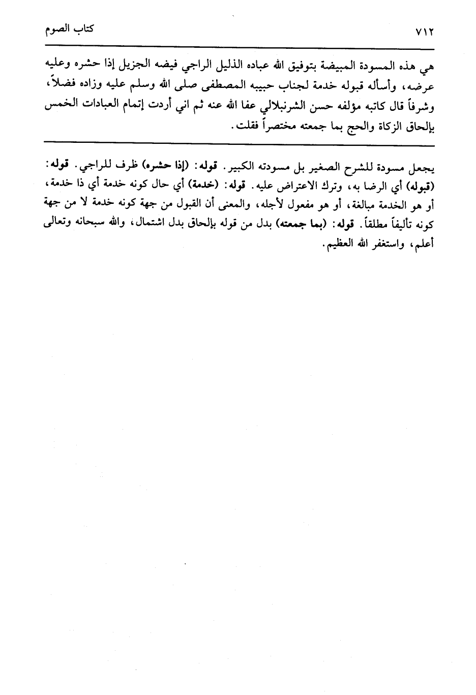 يجعل مسودة للشرح الصغير بل مسودته الكبير قوله: "إذا حشره" ظرف للراجي قوله: "قبوله" أي الرضا به وترك الاعتراض عليه قوله: "خدمة" أي حال كونه خدمة أي ذا خدمة أو هو الخدمة مبالغة أو هو مفعول لأجله والمعنى أن القبول من جهة كونه خدمة لا من جهة كونه تأليفا مطلقا قوله: "بما جمعته" بدل من قوله بإلحاق بدل اشتمال والله سبحانه وتعالى أعلم واستغفر الله العظيم.