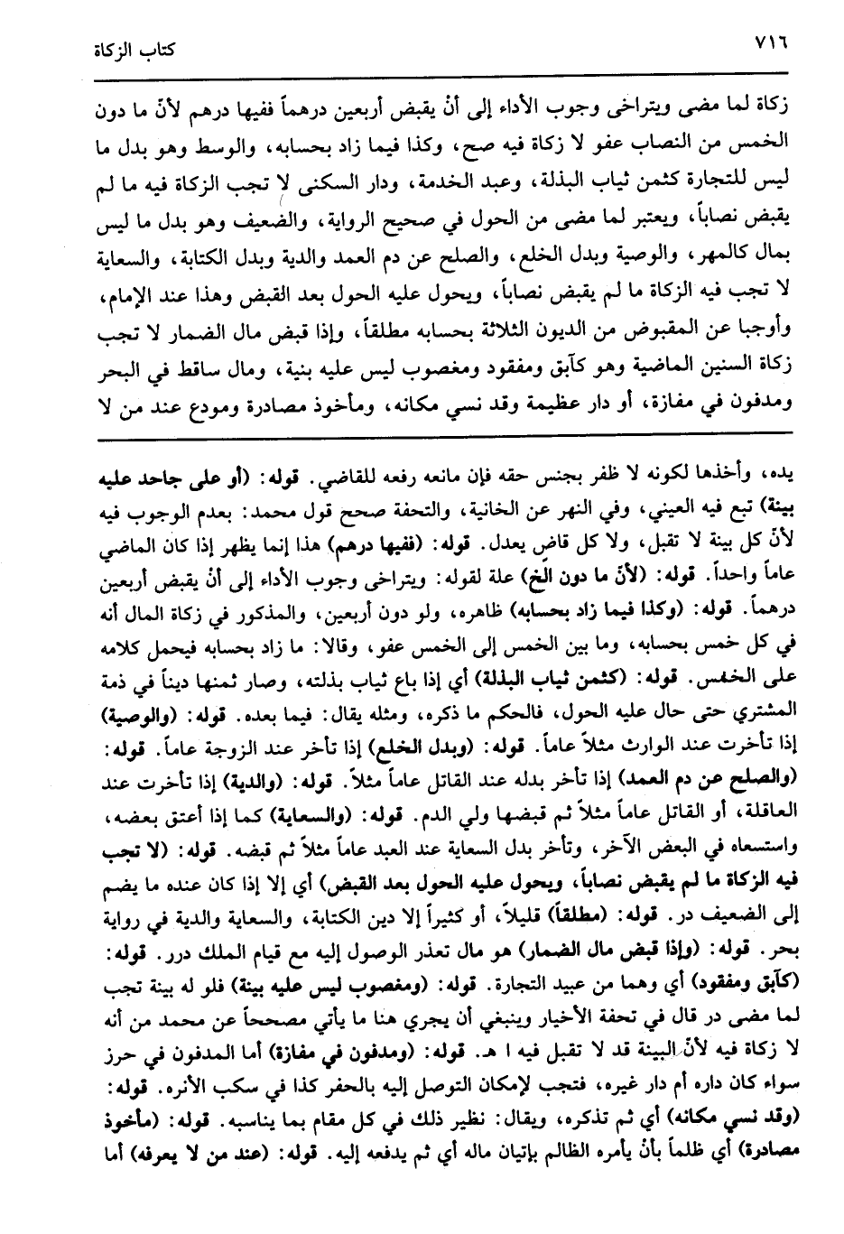 يده وأخذها لكونه لا ظفر بجنس حقه فإن مانعه رفعه للقاضي قوله: "أو على جاحد عليه بينة" تبع فيه العيني وفي النهر عن الخانية والتحفة صحح قول محمد بعدم الوجوب فيه لأن كل بينة لا تقبل ولا كل قاض يعدل قوله: "ففيها درهم" هذا إنما يظهر إذا كان الماضي عاما واحدا قوله: "لأن ما دون الخ" علة لقوله ويتراخى وجوب الأداء إلى أن يقبض أربعين درهما قوله: "وكذا فيما زاد بحسابه" ظاهره ولو دون أربعين والمذكور في زكاة المال أنه في كل خمس بحسابه وما بين الخمس إلى الخمس عفو وقالا ما زاد بحسابه فيحمل كلامه على الخمس قوله: "كثمن ثياب البذلة" أي إذا باع ثياب بذلته وصار ثمنها دينا في ذمة المشتري حتى حال عليه الحول فالحكم ما ذكره ومثله يقال فيما بعده قوله: "والوصية" إذا تأخرت عند الوارث مثلا عاما قوله: "وبدل الخلع" إذا تأخر عند الزوجة عاما قوله: "والصلح عن دم العمد" إذا تأخر بدله عند القاتل عاما مثلا قوله: "والدية" إذا تأخرت عند العاقلة أو القاتل عاما مثلا ثم قبضها ولي الدم قوله: "والسعاية" كما إذا أعتق بعضه واستسعاه في البعض الآخر وتأخر بدل السعاية عند العبد عاما مثلا ثم قبضه قوله: "لا تجب فيه الزكاة ما لم يقبض نصابا ويحول عليه الحول بعد القبض" أي إلا إذا كان عنده ما يضم إلى الضعيف در قوله: "مطلقا" قليلا أو كثيرا إلا دين الكتابة والسعاية والدية في رواية بحر قوله: "وإذا قبض مال الضمار" هو مال تعذر الوصول إليه مع قيام الملك درر قوله: "كا ومفقود" أي وهما من عبيد التجارة قوله: "ومغصوب ليس عليه بينة" فلو له بينة تجب لما مضى در قال في تحفة الأخيار وينبغي أن يجري هنا ما يأتي مصححا عن محمد من أنه لا زكاة فيه لأن البينة قد لا تقبل فيه اهـ قوله: "ومدفون في مفازة" أما المدفون في حرز سواء كان داره أم دار غيره فتجب لإمكان التوصل إليه بالحفر كذا في سكب الأنره قوله: "وقد نسي مكانه" أي ثم تذكره ويقال نظير ذلك في كل مقام بما يناسبه قوله: "مأخوذ مصادرة" أي ظلما بأن يأمره الظالم بإتيان ماله أي ثم يدفعه إليه قوله: "عند من لا يعرفه" أما
