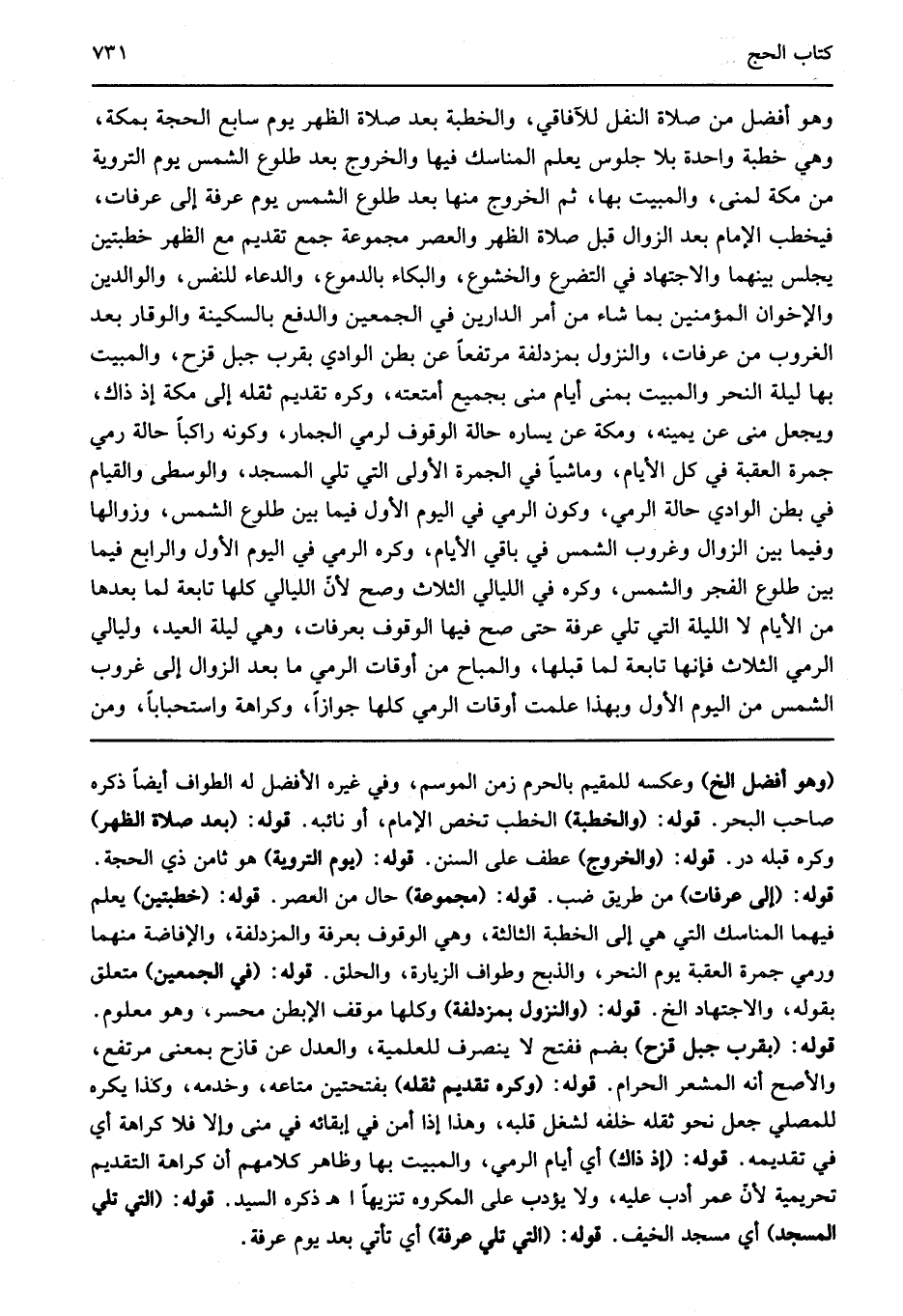 وهو أفضل من صلاة النفل للآفاقي والخطبة بعد صلاة الظهر يوم سابع الحجة بمكة وهي خطبة واحدة بلا جلوس يعلم المناسك فيها والخروج بعد طلوع الشمس يوم التروية من مكة لمنى والمبيت بها ثم الخروج منها بعد طلوع الشمس يوم عرفة إلى عرفات فيخطب الإمام بعد الزوال قبل صلاة الظهر والعصر مجموعة جمع تقديم مع الظهر خطبتين يجلس بينهما والاجتهاد في التضرع والخشوع والبكاء بالدموع والدعاء للنفس والوالدين والإخوان بما شاء من أمر الدارين في الجمعين والدفع بالسكينة والوقار بعد الغروب من عرفات والنزول من مزدلفة مرتفعا عن بطن الوادي بقرب جبل قزح والمبيت بها ليلة النحر والمبيت بمنى أيام منى بجميع أمتعته وكره تقديم ثقله إلى مكة إذ ذاك ويجعل منى عن يمينه ومكة عن يساره حال الوقوف لرمي الجمار وكونه راكبا حالة رمي جمرة العقبة في كل الأيام وماشيا في الجمرة الأولى التي تلي المسجد والوسطى والقيام في بطن الوادي حالة الرمي وكون الرمي في اليوم الأول فيما بين طلوع الشمس وزوالها وفيما بين الزوال وغروب الشمس في باقي الأيام وكره الرمي في اليوم الأول والرابع فيما بين طلوع الفجر والشمس وكره في الليالي الثلاث وصح لأن الليالي كلها تابعة لما بعدها من الأيام إلى الليلة التي تلي عرفة حتى صح فيها الوقوف بعرفات وهي ليلة العيد وهي ثلاث فإنها تابعة لما قبلها أو المباح من أوقات الرمي ما بعد الزوال إلى غروب الشمس من اليوم الأول وبهذا علمت أوقات الرمي كلها جوازا أو كراهة واستحبابا ومن