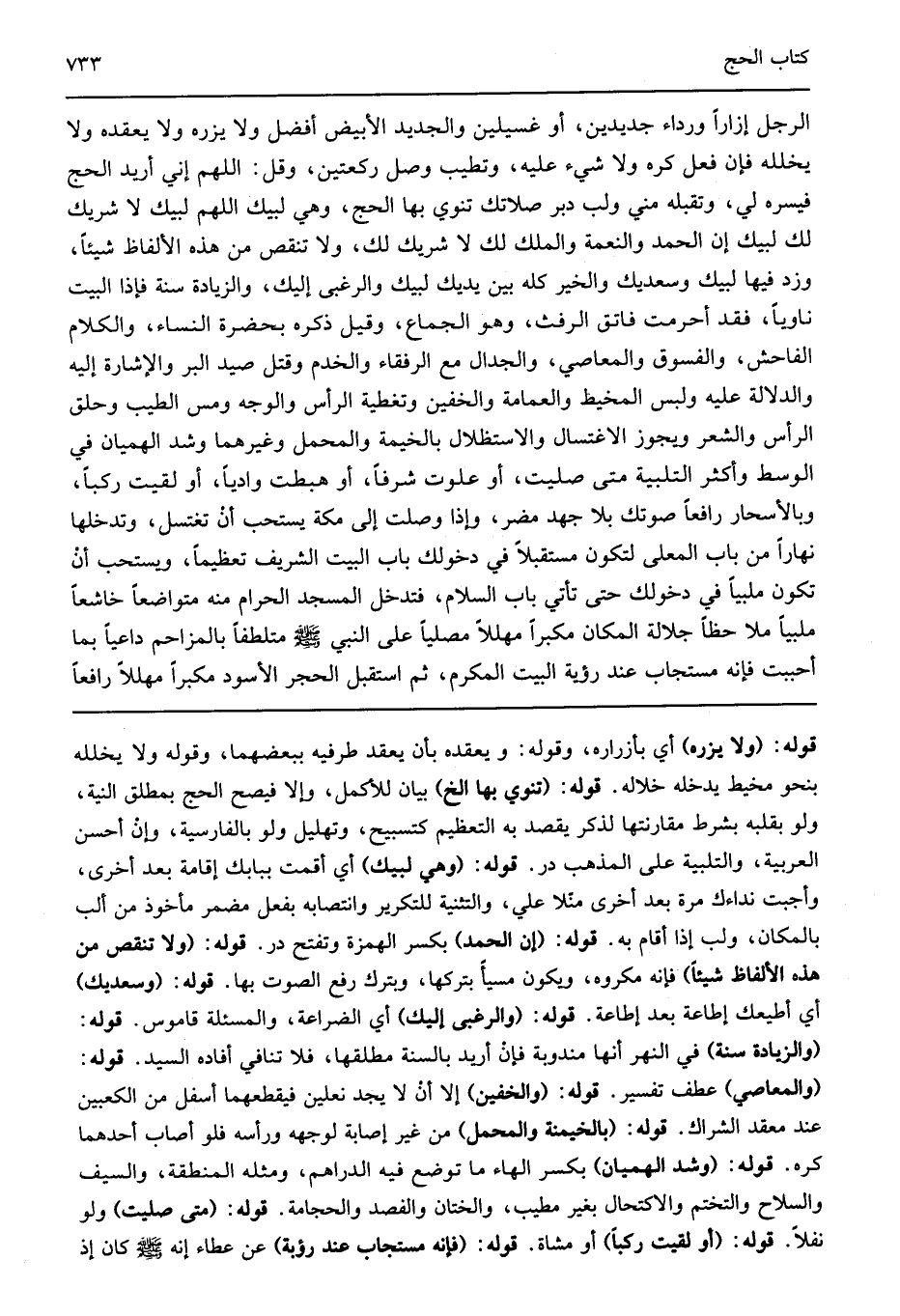 قوله: "ولا يزره" أي بأزراره وقوله ويعقده بأن يعقد طرفيه ببعضهما وقوله ولا يخلله بنحو مخيط يدخله خلاله قوله: "تنوي بها الخ" بيان للأكمل وإلا فيصح الحج بمطلق النية ولو بقلبه بشرط مقارنتها لذكر يقصد به التعظيم كتسبيح وتهليل ولو بالفارسية وإن أحسن العربية والتلبية على المذهب در قوله: "وهي لبيك" أي أقمت ببابك إقامة بعد أخرى وأجبت نداءك مرة بعد أخرى منلا علي والتثنية للتكرير وانتصابه بفعل مضمر مأخوذ من ألب بالمكان ولب إذا أقام به قوله: "إن الحمد" بكسر الهمزة وتفتح در قوله: "ولا تنقص من هذه الألفاظ شيئا" فإنه مكروه ويكون مسيأ بتركها وبترك رفع الصوت بها قوله: "وسعديك" أي أطيعك إطاعة بعد إطاعة قوله: "والرغبى إليك" أي الضراعة والمسئلة قاموس قوله: "والزيادة سنة" في النهر أنها مندوبة فإن أريد بالسنة مطلقها فلا تنافي أفاده السيد قوله: "والمعاصي" عطف تفسير قوله: "والخفين" إلا أن لا يجد نعلين فيقطعهما أسفل من الكعبين عند معقد الشراك قوله: "بالخيمنة والمحمل" من غير إصابة لوجهه ورأسه فلو أصاب أحدهما كره قوله: "وشد الهميان" بكسر الهاء ما توضع فيه الدراهم ومثله المنطقة والسيف والسلاح والتختم والاكتحال بغير مطيب والختان والفصد والحجامة قوله: "متى صليت" ولو نفلا قوله: "أو لقيت ركبا" أو مشاة قوله: "فإنه مستجاب عند رؤبة" عن عطاء إنه صلى الله عليه وسلم كان إذ