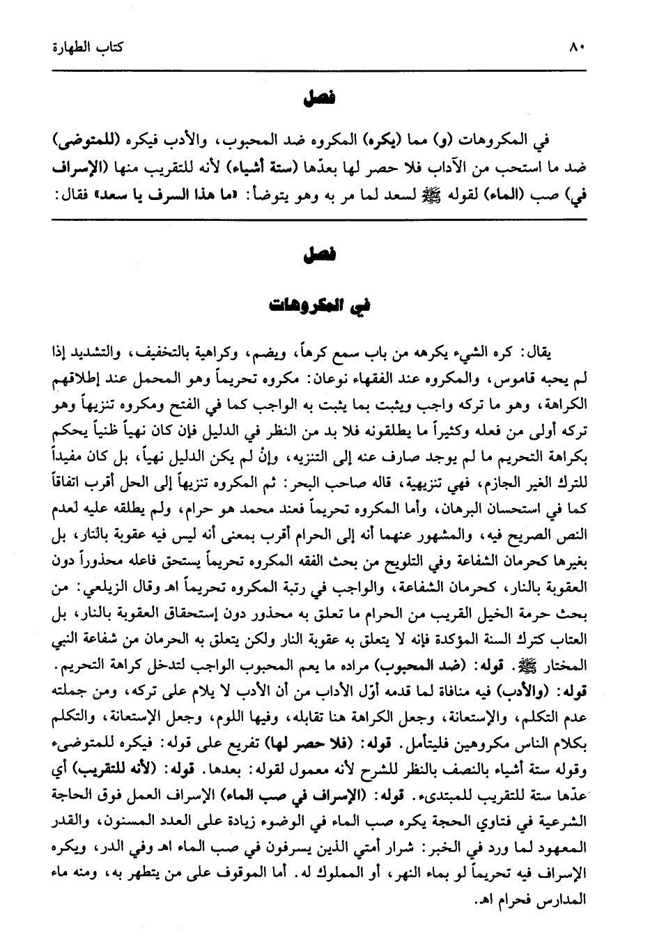 يقال كره الشيء يكرهه من باب سمع كرها ويضم وكراهية بالتخفيف والتشديد إذا لم يحبه قاموس والمكروه عند الفقهاء نوعان مكروه تحريما وهو المحمل عند إطلاقهم الكراهة وهو ما تركه واجب ويثبت بما يثبت به الواجب كما في الفتح ومكروه تنزيها وهو تركه أولى من فعله وكثيرا ما يطلقونه فلا بد من النظر في الدليل فإن كان نهيا ظنيا يحكم بكراهة التحريم ما لم يوجد صارف عنه إلى التنزيه وإن لم يكن الدليل نهيا بل كان مفيدا للترك الغير الجازم فهي تنزيهية قاله صاحب البحر ثم المكروه تنزيها إلى الحل أقرب اتفاقا كما في استحسان البرهان وأما المكروه تحريما فعند محمد هو حرام ولم يطلقه عليه لعدم النص الصريح فيه والمشهور عنهما أنه إلى الحرام أقرب بمعنى أنه ليس فيه عقوبة بالنار بل بغيرها كحرمان الشفاعة وفي التلويح من بحث الفقه المكروه تحريما يستحق فاعله محذورا دون العقوبة بالنار كحرمان الشفاعة والواجب في رتبة المكروه تحريما اهـ وقال الزيلعي من بحث حرمة الخيل القريب من الحرام ما تعلق به محذور دون إستحقاق العقوبة بالنار بل العتاب كترك السنة المؤكدة فإنه لا يتعلق به عقوبة النار ولكن يتعلق به الحرمان من شفاعة النبي المختار صلى الله عليه وسلم قوله: "ضد المحبوب" مراده ما يعم المحبوب الواجب لتدخل كراهة التحريم قوله: "والأدب" فيه منافاة لما قدمه أول الأداب من أن الأدب لا يلام على تركه ومن جملته عدم التكلم والإستعانة وجعل الكراهة هنا تقابله وفيها اللوم وجعل الإستعانة والتكلم بكلام الناس مكروهين فليتأمل قوله: "فلا حصر لها" تفريع على قوله فيكره للمتوضىء وقوله ستة أشياء بالنصب بالنظر للشرح لأنه معمول لقوله بعدها قوله: "لأنه للتقريب" أي عدها ستة للتقريب للمبتدىء قوله: "الإسراف في صب الماء" الإسراف العمل فوق الحاجة الشرعية في فتاوي الحجة يكره صب الماء في الوضوء زيادة على العدد المسنون والقدر المعهود لما ورد في الخبر شرار أمتي الذين يسرفون في صب الماء اهـ وفي الدر ويكره الإسراف فيه تحريما لو بماء النهر أو المملوك له أما الموقوف على من يتطهر به ومنه ماء المدارس فحرام اهـ.