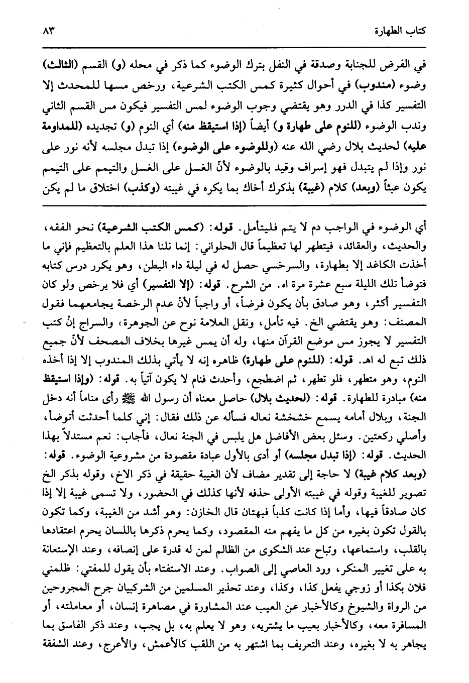 أي الوضوء في الواجب دم لا يتم فليتأمل قوله: "كمس الكتب الشرعية" نحو الفقه والحديث والعقائد فيتطهر لها تعظيما قال الحلواني إنما نلنا هذا العلم بالتعظيم فإني ما أخذت الكاغد إلا بطهارة والسرخسي حصل له في ليلة داء البطن وهو يكرر درس كتابه فتوضأ تلك الليلة سبع عشرة مرة اهـ من الشرح قوله: "إلا التفسير" أي فلا يرخص ولو كان التفسير أكثر وهو صادق بأن يكون فرضا أو واجبا لأن عدم الرخصة يجامعهما فقول المصنف وهو يقتضي الخ فيه تأمل ونقل العلامة نوح عن الجوهرة والسراج إن كتب التفسير لا يجوز مس موضع القرآن منها وله أن يمس غيرها بخلاف المصحف لأن جميع ذلك تبع له اهـ قوله: "للنوم على طهارة" ظاهره إنه لا يأتي بذلك المندوب إلا إذا أخذه النوم وهو متطهر فلو تطهر ثم اضطجع وأحدث فنام لا يكون آتيا به قوله: "وإذا استيقظ منه" مبادرة للطهارة قوله: "لحديث بلال" حاصل معناه أن رسول الله صلى الله عليه وسلم رأى مناما أنه دخل الجنة وبلال أمامه يسمع خشخشة نعاله فسأله عن ذلك فقال: إني كلما أحدثت أتوضأ وأصلي ركعتين وسئل بعض الأفاضل هل يلبس في الجنة نعال فأجاب نعم مستدلا بهذا الحديث قوله: "إذا تبدل مجلسه" أو أدى بالأول عبادة مقصودة من مشروعية الوضوء قوله: "وبعد كلام غيبة" لا حاجة إلى تقدير مضاف لأن الغيبة حقيقة في ذكر الاخ وقوله بذكر الخ تصوير للغيبة وقوله في غيبته الأولى حذفه لأنها كذلك في الحضور ولا تسمى غيبة إلا إذا كان صادقا فيها وأما إذا كانت كذبا فبهتان قال الخازن وهو أشد من الغيبة وكما تكون بالقول تكون بغيره من كل ما يفهم منه المقصود وكما يحرم ذكرها باللسان يحرم اعتقادها بالقلب واستماعها وتباح عند الشكوى من الظالم لمن له قدرة على إنصافه وعند الإستعانة به على تغيير المنكر ورد العاصي إلى الصواب وعند الاستفتاء بأن يقول للمفتي ظلمني فلان بكذا أو زوجي يفعل كذا وكذا وعند تحذير المسلمين من الشركبيان جرح المجروحين من الرواة والشيوخ وكالأخبار عن العيب عند المشاورة في مصاهرة إنسان أو معاملته أو المسافرة معه وكالأخبار بعيب ما يشتريه وهو لا يعلم به بل يجب وعند ذكر الفاسق بما يجاهر به لا بغيره وعند التعريف بما اشتهر به من اللقب كالأعمش والأعرج وعند الشفقة.