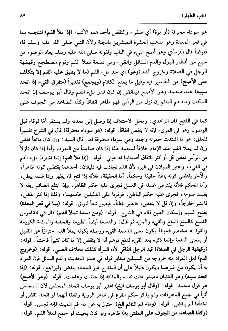 كما في الفتح قال الزاهدي ومحل الاختلاف إذا وصل إلى معدته ولم يستقر أما لوقاء قبل الوصول وهو في المرىء فإنه لا ينقض اتفاقا قوله: "هو سوداء محترقة" قال في الشرح تفسيرا للعلق هو ما اشتدت حمرته وجمد وهي سوداء محترقة اهـ قال السيد وإن كان مائعا نقض وإن لم يملا الفم عند الإمام خلافا لمحمد هذا إذا كان صاعدا من الجوف وأما إذا كان نازلا من الرأس نقض قل أو كثر باتفاق أصحابنا اهـ عيني قوله: "إذا ملأ الفم" إنما اشترط ملء الفم في القيء واعتبر السيلان في غيره لأن الفم تجاذب فيه دليلان أحدهما يقتضي كونه ظاهرا والآخر يقتضي كونه باطنا حقيقة وحكما أما الحقيقة فلأنه إذا فتح فاه يظهر وإذا ضمه يبطن وأما الحكم فلأنه يفترض غسله في الغسل فجرى عليه حكم الظاهر وإذا ابتلع الصائم ريقه لا يفسد صومه فجرى عليه حكم الباطن فوفرنا على الدليلين حكمهما وقلنا إذا كثر نقض فاعتبر خارجا وإن قل لا ينقض فاعتبر باطنا فيصير تبعا للريق قوله: "بما في قعر المعدة" بفتح الميم وإسكان العين قاله في الشرح قوله: "ومن دسعة تملأ الفم" قال في القاموس الدسع كالمنع الدفع والقيء والملء ثم قال والدسعة أيضا الطبيعة والجفنة والمائدة الكريمة والقوة اهـ مختصرا فحينئذ يكون معنى الدسعة القيء ووصفه بكونه يملأ الفم احترازا عن القليل أو بمعنى الدفعة وإنما ذكره بعد القيء لدفع توهم أنه لا ينقض إلا ما كان كثيرا فاحشا قوله: "قوله وقهقهة الرجل في الصلاة" قيد الرجل اتفاقي لأن المرأة كذلك بخلاف الصبي قوله: "وخروج الدم" لعل المراد منه خروجه من السبيلين فيغاير قوله في صدر الحديث والدم السائل فإن المراد به أن يكون من غيرهما ويكون دليلا على أن الخارج غير المعتاد ينقض وليراجع قوله: "إذا اتحد سببه" وهو الغثيان مصدر غثت نفسه بالمثلثة إذا جاشت وهاجت قوله: "وهو الأصح" هو قول محمد قوله: "وقال أبو يوسف الخ" اعتبر أبو يوسف اتحاد المجلس لأن للمجلس أثرا في جمع المتفرقات ولم يذكر حكم الفرع في ظاهر الرواية واتفقا أنهما لو اتحدا نقض أو اختلفا لم ينقض قوله: "وماء النائم الخ" احترز به عن ماء الميت فإنه نجس قوله: "وكذا الصاعد من الجوف على المفتى به" ظاهره ولو كان بحيث لو جمع لملأ الفم قوله:.