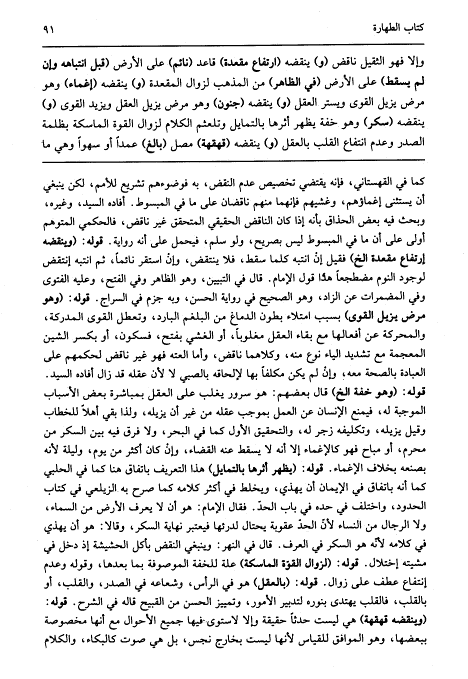 كما في القهستاني فإنه يقتضي تخصيص عدم النقض به فوضوءهم تشريع للأمم لكن ينبغي أن يستثنى إغماؤهم وغشيهم فإنهما منهم ناقضان على ما في المبسوط أفاده السيد وغيره وبحث فيه بعض الحذاق بأنه إذا كان الناقض الحقيقي المتحقق غير ناقض فالحكمي المتوهم أولى على أن ما في المبسوط ليس بصريح ولو سلم فيحمل على أنه رواية قوله: "وينقضه إرتفاع مقعدة الخ" فقيل إن انتبه كلما سقط فلا ينتقض وإن استقر نائما ثم انتبه إنتقض لوجود النوم مضطجعا هذا قول الإمام قال في التبيين وهو الظاهر وفي الفتح وعليه الفتوى وفي المضمرات عن الزاد وهو الصحيح في رواية الحسن وبه جزم في السراج قوله: "وهو مرض يزيل القوى" بسبب امتلاء بطون الدماغ من البلغم البارد وتعطل القوى المدركة والمحركة عن أفعالها مع بقاء العقل مغلوبا والغشي بفتح فسكون أو بكسر الشين المعجمة مع تشديد الياء نوع منه وكلاهما ناقض وأما العته فهو غير ناقض لحكمهم على العبادة بالصحة معه وإن لم يكن مكلفا بها لإلحاقه بالصبي لا لأن عقله قد زال أفاده السيد قوله: "وهو خفة الخ" قال بعضهم هو سرور يغلب على العقل بمباشرة بعض الأسباب الموجبة له فيمنع الإنسان عن العمل بموجب عقله من غير أن يزيله ولذا بقي أهلا للخطاب وقيل يزيله وتكليفه زجر له والتحقيق الأول كما في البحر ولا فرق فيه بين السكر من محرم أو مباح فهو كالإغماء إلا أنه لا يسقط عنه القضاء وإن كان أكثر من يوم وليلة لأنه بصنعه بخلاف الإغماء قوله: "يظهر أثرها بالتمايل" هذا التعريف باتفاق هنا كما في الحلبي كما أنه باتفاق في الإيمان أن يهذي ويخلط في أكثر كلامه كما صرح به الزيلعي في كتاب الحدود واختلف في حده في باب الحد فقال الإمام: هو أن لا يعرف الأرض من السماء ولا الرجال من النساء لأن الحد عقوبة يحتال لدرئها فيعتبر نهاية السكر وقالا هو أن يهذي في كلامه لأنه هو السكر في العرف قال في النهر وينبغي النقض بأكل الحشيشة إذ دخل في مشيته إختلال قوله: "لزوال القوة الماسكة" علة للخفة الموصوفة بما بعدها وقوله وعدم إنتفاع عطف على زوال قوله: "بالعقل" هو في الرأس وشعاعه في الصدر والقلب أو بالقلب فالقلب يهتدى بنوره لتدبير الأمور وتمييز الحسن من القبيح قاله في الشرح قوله: "وينقضه قهقهة" هي ليست حدثا حقيقة وإلا لاستوى فيها جميع الأحوال مع أنها مخصوصة ببعضها وهو الموافق للقياس لأنها ليست بخارج نجس بل هي صوت كالبكاء والكلام.