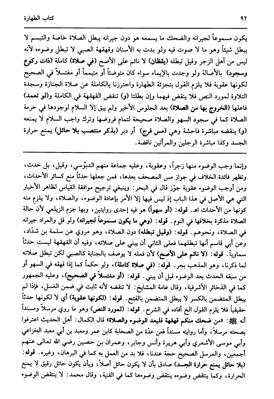 وإنما وجب الوضوء منها زجرا وعقوبة وعليه جماعة منهم الدبوسي وقيل بل حدث وتظهر فائدة الخلاف في جواز مس المصحف بعدها فمن جعلها حدثا منع كسائر الأحداث ومن أوجب الوضوء عقوبة جوز قال في البحر وينبغي ترجيح موافقة القياس لظاهر الأخبار التي هي الأصل في هذا الباب إذ ليس فيها إلا الأمر بإعادة الوضوء والصلاة ولا يلزم منه كونها من الأحداث اهـ قوله: "أو سهوا" هو فيه إحدى روايتين وبها جزم الزيلعي لأن حالة الصلاة مذكرة بخلافها في النوم قوله: "وهي ما يكون مسموعا لجيرانه" ولو قل والمراد جيرانه في الصلاة ونحوهم قوله: "وقيل تبطله" دون الصلاة وهو مروي عن سلمة بن شداد وعن أبي قاسم أنها تبطلهما فعلى الثاني أن يبني على صلاته وفيه أن القهقهة ليست حدثا سماويا قوله: "لا نائم على الأصح" لأن فعله لا يوصف بالجنابة كالصبي لكن تبطل صلاته لما ذكرنا وهو المذهب بحر قوله: "في صلاة كاملة" ولو حكما كما إذا قهقه في السهو أو من سبقه الحدث بعد الوضوء قبل أن يبني قوله: "أو مغتسلا في الصحيح" وعليه الجمهور كما في الذخائر الأشرفية وقال عامة المشايخ لا تنقضه لأنه ثابت في ضمن الغسل فإذا لم يبطل المتضمن بالكسر لا يبطل المتضمن بالفتح قوله: "لكونها عقوبة" أي لا لكونها حدثا حقيقيا فلا يلزم القول الخ أفاده في الشرح قوله: "لمورد النص" وهو ما روي مرسلا ومسندا أنه صلى الله عليه وسلم: "من ضحك منكم قهقهة فليعد الوضوء والصلاة" قال الكمال أهل الحديث اعترفوا بصحته مرسلا وأما روايته مسندا فعن عدة من الصحابة كابن عمر ومعبد بن أبي معبد الخزاعي وأبي موسى الأشعري وأبي هريرة وأنس وجابر وعمران بن حصين رضي الله تعالى عنهم أجمعين والمرسل الصحيح حجة عندنا فلا بد من العمل به كما في البرهان وغيره قوله: "بلا حائل يمنع حرارة الجسد" صادق بأن لا يكون حائل أصلا وبأن يكون حائل رقيق لا يمنع الحرارة وكما ينتقض وضوءه ينتقض وضوءها كما في القنية وقال محمد لا ينتقض الوضوء.