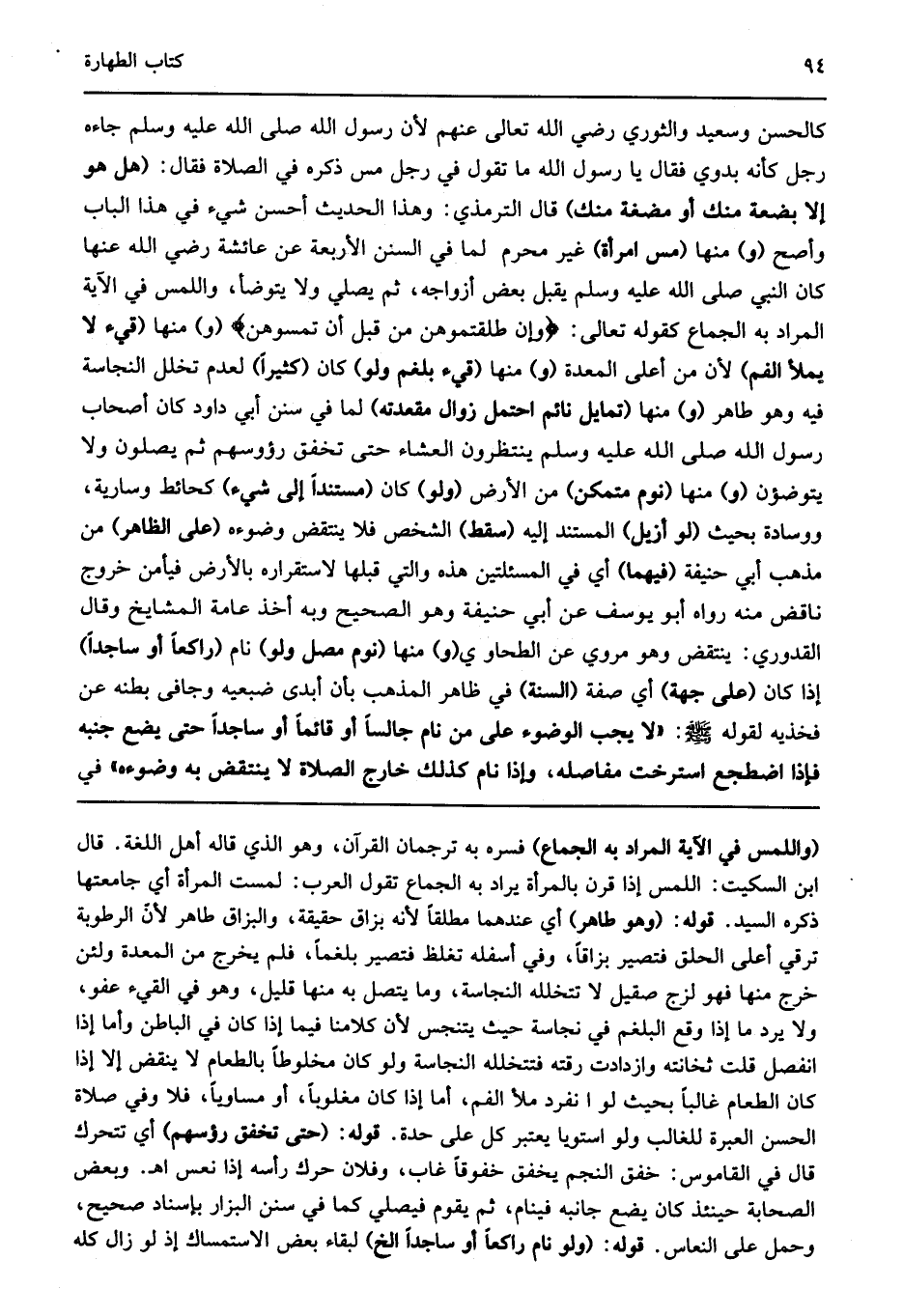 "واللمس في الآية المراد به الجماع " فسره به ترجمان القرآن وهو الذي قاله أهل اللغة قال ابن السكيت اللمس إذا قرن بالمرأة يراد به الجماع تقول العرب لمست المرأة أي جامعتها ذكره السيد قوله: "وهو طاهر" أي عندهما مطلقا لأنه بزاق حقيقة والبزاق طاهر لأن الرطوبة ترقي أعلى الحلق فتصير بزاقا وفي أسفله تغلظ فتصير بلغما فلم يخرج من المعدة ولئن خرج منها فهو لزج صقيل لا تتخلله النجاسة وما يتصل به منها قليل وهو في القيء عفو ولا يرد ما إذا وقع البلغم في نجاسة حيث يتنجس لأن كلامنا فيما إذا كان في الباطن وأما إذا انفصل قلت ثخانته وازدادت رقته فتتخلله النجاسة ولو كان مخلوطا بالطعام لا ينقض إلا إذا كان الطعام غالبا بحيث لو انفرد ملأ الفم أما إذا كان مغلوبا أو مساويا فلا وفي صلاة الحسن العبرة للغالب ولو استويا يعتبر كل على حدة قوله: "حتى تخفق رؤسهم" أي تتحرك قال في القاموس خفق النجم يخفق خفوقا غاب وفلان حرك رأسه إذا نعس اهـ وبعض الصحابة حينئذ كان يضع جانبه فينام ثم يقوم فيصلي كما في سنن البزار بإسناد صحيح وحمل على النعاس قوله: "ولو نام راكعا أو ساجدا الخ" لبقاء بعض الاستمساك إذ لو زال كله.