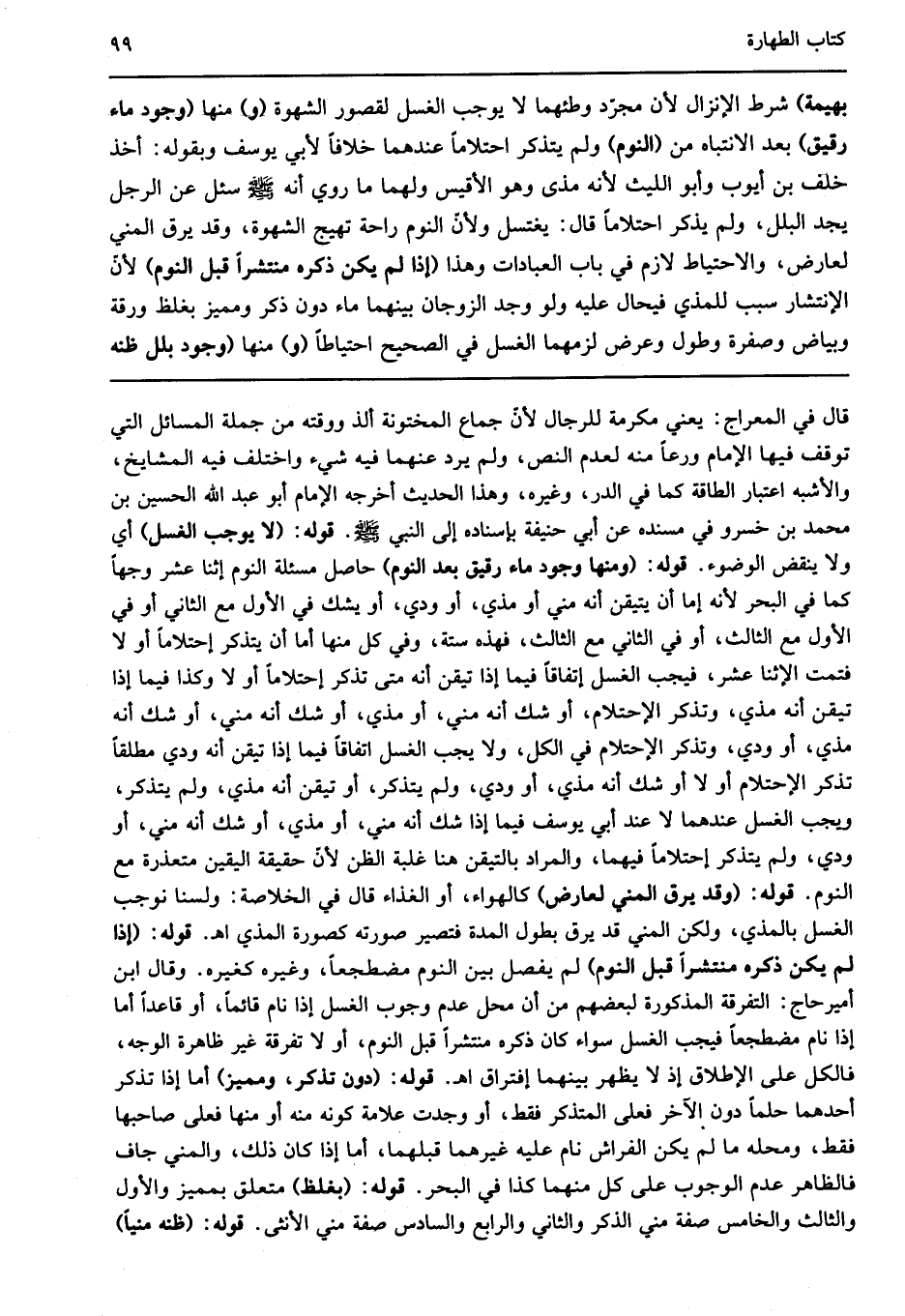 قال في المعراج يعني مكرمة للرجال لأن جماع المختونة ألذ ووقته من جملة المسائل التي توقف فيها الإمام ورعا منه لعدم النص ولم يرد عنهما فيه شيء واختلف فيه المشايخ والأشبه اعتبار الطاقة كما في الدر وغيره وهذا الحديث أخرجه الإمام أبو عبد الله الحسين بن محمد بن خسر وفي مسنده عن أبي حنيفة بإسناده إلى النبي صلى الله عليه وسلم قوله: "لا يوجب الغسل" أي ولا ينقض الوضوء قوله: "ومنها وجود ماء رقيق بعد النوم" حاصل مسئلة النوم إثنا عشر وجها كما في البحر لأنه إما أن يتيقن أنه مني أو مذي أو ودي أو يشك في الأول مع الثاني أو في الأول مع الثالث أو في الثاني مع الثالث فهذه ستة وفي كل منها أما أن يتذكر إحتلاما أو لا فتمت الإثنا عشر فيجب الغسل إتفاقا فيما إذا تيقن أنه متى تذكر إحتلاما أو لا وكذا فيما إذا تيقن أنه مذي وتذكر الإحتلام أو شك أنه مني أو مذي أو شك أنه مني أو شك أنه مذي أو ودي وتذكر الإحتلام في الكل ولا يجب الغسل اتفاقا فيما إذا تيقن أنه ودي مطلقا تذكر الإحتلام أو لا أو شك أنه مذي أو ودي ولم يتذكر أو تيقن أنه مذي ولم يتذكر ويجب الغسل عندهما لا عند أبي يوسف فيما إذا شك أنه مني أو مذي أو شك أنه مني أو ودي ولم يتذكر إحتلاما فيهما والمراد بالتيقن هنا غلبة الظن لأن حقيقة اليقين متعذرة مع النوم قوله: "وقد يرق المني لعارض" كالهواء أو الغذاء قال في الخلاصة ولسنا نوجب الغسل بالمذي ولكن المني قد يرق بطول المدة فتصير صورته كصورة المذي اهـ قوله: "إذا لم يكن ذكره منتشرا قبل النوم" لم يفصل بين النوم مضطجعا وغيره كغيره وقال ابن أمير حاج التفرقة المذكورة لبعضهم من أن محل عدم وجوب الغسل إذا نام قائما أو قاعدا أما إذا نام مضطجعا فيجب الغسل سواء كان ذكره منتشرا قبل النوم أو لا تفرقة غير ظاهرة الوجه فالكل على الإطلاق إذ لا يظهر بينهما إفتراق اهـ قوله: "دون تذكر ومميز" أما إذا تذكر أحدهما حلما دون الآخر فعلى المتذكر فقط أو وجدت علامة كونه منه أو منها فعلى صاحبها فقط ومحله ما لم يكن الفراش نام عليه غيرهما قبلهما أما إذا كان ذلك والمني جاف فالظاهر عدم الوجوب على كل منهما كذا في البحر قوله: "بغلظ" متعلق بمميز والأول والثالث والخامس صفة مني الذكر والثاني والرابع والسادس صفة مني الأنثى قوله: "ظنه منيا".