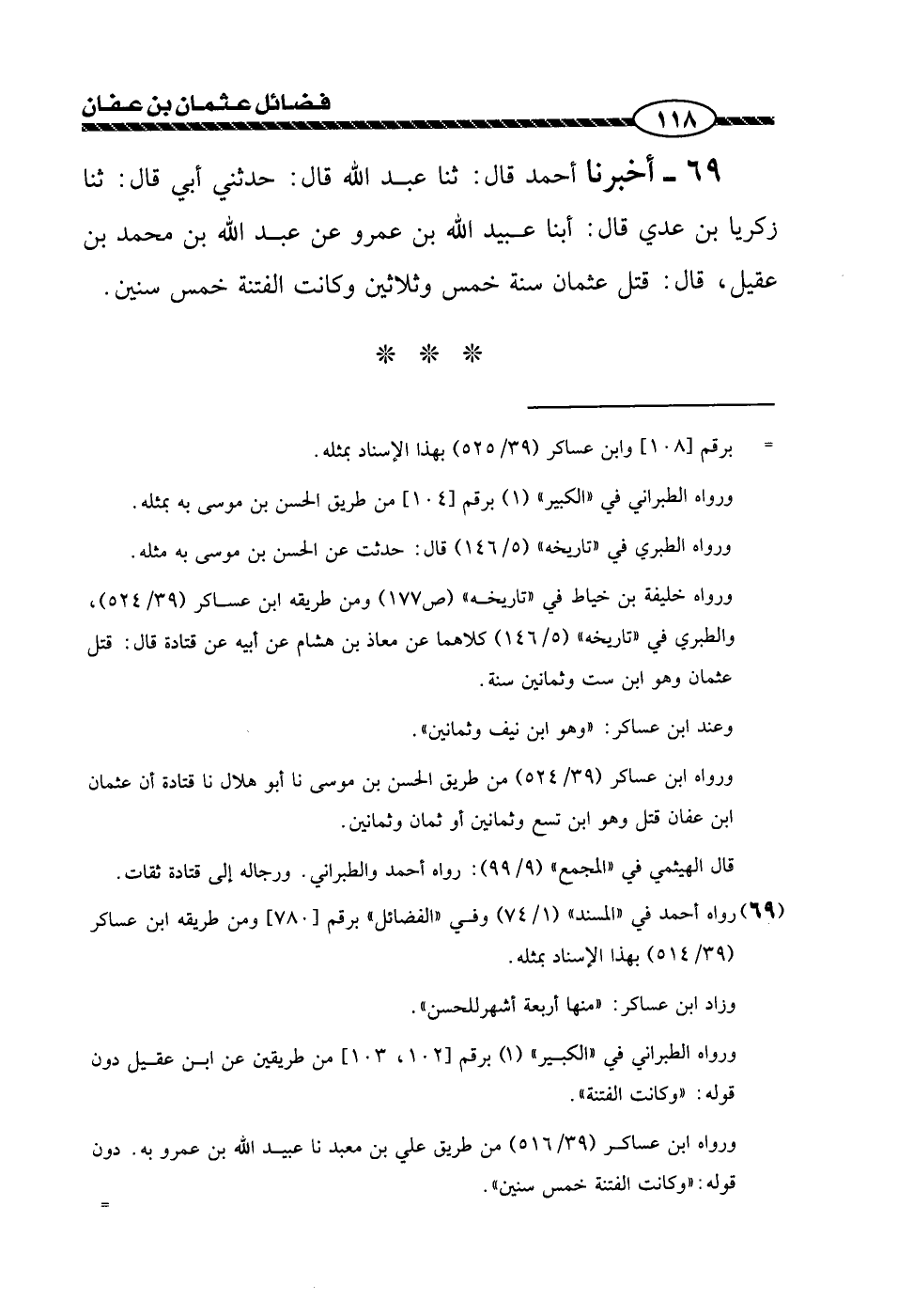 69 - حَدَّثَنِي أَبِي، قَالَ: ثنا زَكَرِيَّا بْنُ عَدِيٍّ، قَالَ: أَبنا عُبَيْدُ اللَّهِ بْنُ عَمْرٍو، عَنْ عَبْدِ اللَّهِ بْنِ مُحَمَّدِ بْنِ عَقِيلٍ، قَالَ: «§قُتِلَ عُثْمَانُ سَنَةَ خَمْسٍ وَثَلَاثِينَ، وَكَانَتِ الْفِتْنَةُ خَمْسَ سِنِينَ»