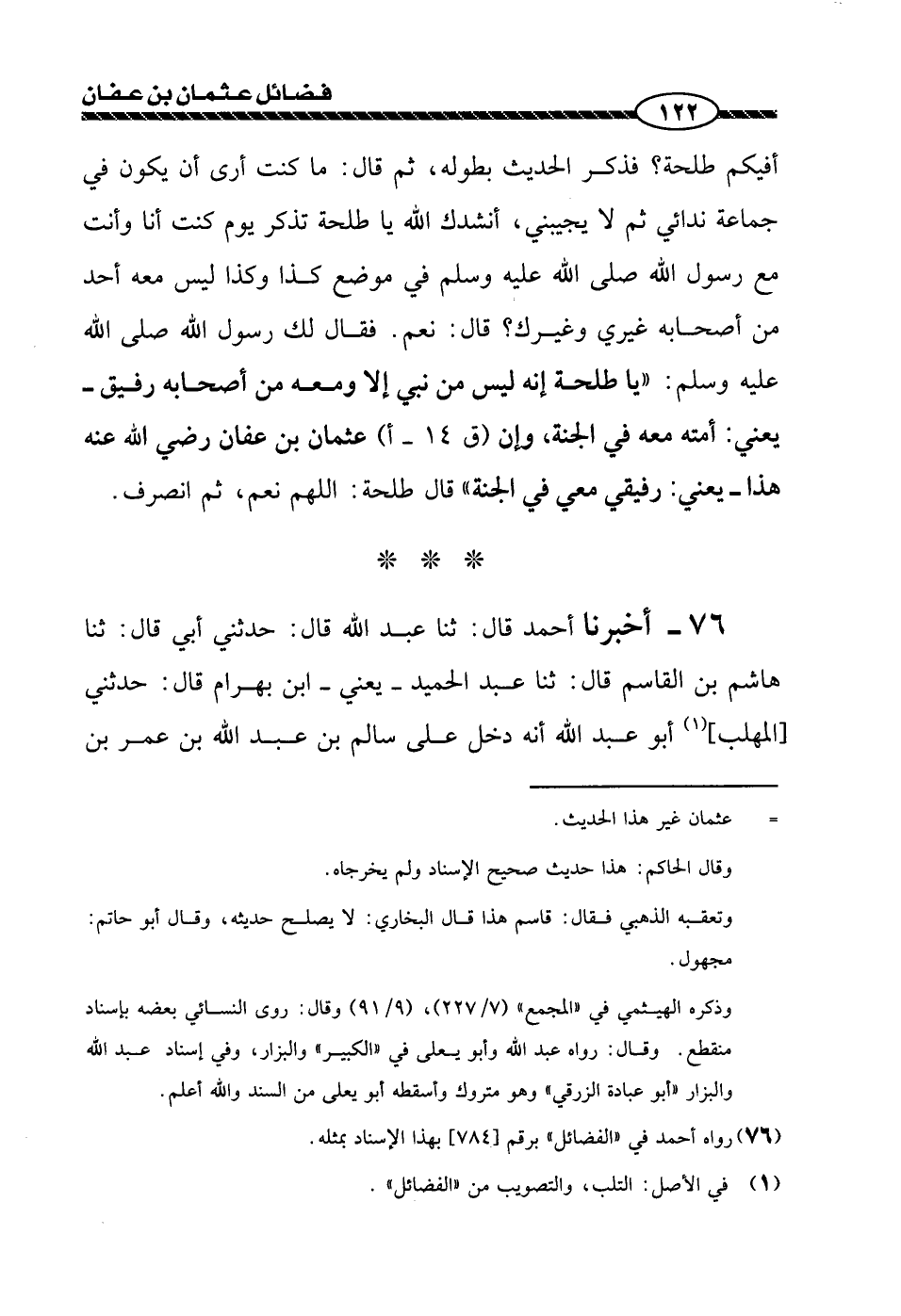 76 - حَدَّثَنِي أَبِي، قَالَ: ثنا هَاشِمُ بْنُ الْقَاسِمِ، قَالَ: ثنا عَبْدُ الْحَمِيدِ يَعْنِي ابْنَ بَهْرَامَ، قَالَ: حَدَّثَنِي الْمُهَلَّبُ أَبُو عَبْدِ اللَّهِ، أَنَّهُ دَخَلَ عَلَى سَالِمِ بْنِ عَبْدِ اللَّهِ بْنِ عُمَرَ بْنِ -[123]- الْخَطَّابِ، وَكَانَ الرَّجُلُ مِمَّنْ يَحْمَدُ عَلِيَّ بْنَ أَبِي طَالِبٍ وَيَذُمُّ عُثْمَانَ رَضِيَ اللَّهُ عَنْهُمَا، فَقَالَ الرَّجُلُ: يَا أَبَا الْفَضْلِ، أَلَا تُخْبِرُنِي هَلْ شَهِدَ عُثْمَانُ الْبَيْعَتَيْنِ كِلْتَيْهِمَا، بَيْعَةَ الرِّضْوَانِ وَبَيْعَةَ الْفَتْحِ؟ فَقَالَ سَالِمٌ: لَا. فَكَبَّرَ الرَّجُلُ، وَقَامَ وَنَفَضَ رِدَاءَهُ وَخَرَجَ مُنْطَلِقًا، فَلَمَّا أَنْ خَرَجَ قَالَ لَهُ جُلَسَاؤُهُ: وَاللَّهِ مَا أَرَاكَ تَدْرِي مَا أَمْرُ الرَّجُلِ؟ قَالَ: أَجَلْ، لَا. قَالُوا: فَإِنَّهُ مِمَّنْ يَحْمَدُ عَلِيًّا وَيَذُمُّ عُثْمَانَ. قَالَ: عَلَيَّ بِالرَّجُلِ، فَأَرْسَلَ إِلَيْهِ، فَلَمَّا أَتَاهُ، قَالَ: يَا عَبْدَ اللَّهِ الصَّالِحَ، إِنَّكَ سَأَلْتَنِي: هَلْ شَهِدَ عُثْمَانُ الْبَيْعَتَيْنِ كِلْتَيْهِمَا، بَيْعَةَ الرِّضْوَانِ وَبَيْعَةَ الْفَتْحِ؟ فَقُلْتُ: لَا. فَكَبَّرْتَ، وَخَرَجْتَ شَامِتًا، فَلَعَلَّكَ مِمَّنْ يَحْمَدُ عَلِيًّا وَيَذُمُّ عُثْمَانَ رَضِيَ اللَّهُ عَنْهُمَا؟ قَالَ: أَجَلْ وَاللَّهِ، إِنِّي لَمِنْهُمْ. قَالَ: فَاسْمَعْ وَافْهَمْ ثُمَّ ارْوِ عَنِّي، فَإِنَّ رَسُولَ اللَّهِ صَلَّى اللهُ عَلَيْهِ وَسَلَّمَ لَمَّا بَايَعَ النَّاسَ تَحْتَ الشَّجَرَةِ وَكَانَ بَعَثَ عُثْمَانَ فِي سَرِيَّةٍ وَكَانَ فِي حَاجَةِ اللَّهِ عَزَّ وَجَلَّ، وَحَاجَةِ رَسُولِهِ صَلَّى اللهُ عَلَيْهِ وَسَلَّمَ، وَحَاجَةِ الْمُؤْمِنِينَ، فَقَالَ رَسُولُ اللَّهِ صَلَّى اللهُ عَلَيْهِ وَسَلَّمَ: «أَلَا إِنَّ §يَمِينِي يَدِي، وَإِنَّ شِمَالِي يَدُ عُثْمَانَ» فَضَرَبَ بِشِمَالِهِ عَلَى يَمِينِهِ، فَقَالَ: «هَذِهِ يَدُ عُثْمَانَ، وَإِنِّي قَدْ بَايَعْتُ لَهُ» ثُمَّ كَانَ مِنْ شَأْنِ عُثْمَانَ فِي الْبَيْعَةِ الثَّانِيَةِ أَنَّ رَسُولَ اللَّهِ صَلَّى اللهُ عَلَيْهِ وَسَلَّمَ بَعَثَ عُثْمَانَ إِلَى عَلِيٍّ رَضِيَ اللَّهُ عَنْهُمَا وَكَانَ أَمِيرَ الْيَمَنِ فَصَنَعَ بِهِ مِثْلَ ذَلِكَ، ثُمَّ كَانَ مِنْ شَأْنِ عُثْمَانَ أَنَّ رَسُولَ اللَّهِ صَلَّى اللهُ عَلَيْهِ وَسَلَّمَ قَالَ لِرَجُلٍ مِنْ أَهْلِ مَكَّةَ: «يَا فُلَانُ أَلَا تَبِيعُنِي دَارَكَ أَزِيدُهَا فِي مَسْجِدِ الْكَعْبَةِ بِبَيْتٍ أَضْمَنُهُ لَكَ فِي الْجَنَّةِ؟» فَقَالَ لَهُ الرَّجُلُ: يَا رَسُولَ اللَّهِ، مَا لِي بَيْتٌ غَيْرُهُ، فَإِنْ أَنَا بِعْتُكَ دَارِي لَا يُؤْوِينِي وَوَلَدِي بِمَكَّةَ شَيْءٌ. قَالَ: «أَلَا، بَلْ -[124]- بِعْنِي دَارَكَ أَزِيدُهَا فِي مَسْجِدِ الْكَعْبَةِ بِبَيْتٍ أَضْمَنُهُ لَكَ فِي الْجَنَّةِ؟» فَقَالَ الرَّجُلُ: وَاللَّهِ مَا لِي فِي ذَلِكَ حَاجَةٌ وَلَا أُرِيدُهُ. فَبَلَغَ ذَلِكَ عُثْمَانَ وَكَانَ الرَّجُلُ نَدْمَانًا لِعُثْمَانَ فِي الْجَاهِلِيَّةِ وَصَدِيقًا، فَأَتَاهُ فَقَالَ: يَا فُلَانُ، بَلَغَنِي أَنَّ رَسُولَ اللَّهِ صَلَّى اللهُ عَلَيْهِ وَسَلَّمَ أَرَادَ مِنْكَ دَارَكَ لَيَزِيدَهَا فِي مَسْجِدِ الْكَعْبَةِ بِبَيْتٍ يَضْمَنُهُ لَكَ فِي الْجَنَّةِ فَأَبَيْتَ عَلَيْهِ؟ قَالَ: أَجَلْ قَدْ أَبَيْتُ، فَلَمْ يَزَلْ عُثْمَانُ يُرَاوِدُهُ حَتَّى اشْتَرَى مِنْهُ دَارَهُ بِعَشَرَةِ آلَافِ دِينَارٍ، ثُمَّ أَتَى رَسُولَ اللَّهِ صَلَّى اللهُ عَلَيْهِ وَسَلَّمَ فَقَالَ: يَا رَسُولَ اللَّهِ، بَلَغَنِي أَنَّكَ أَرَدْتَ مِنْ فُلَانٍ دَارَهُ لِتَزِيدَهَا فِي مَسْجِدِ الْكَعْبَةِ بِبَيْتٍ تَضْمَنُ لَهُ فِي الْجَنَّةِ، وَإِنَّمَا هِيَ دَارِي، فَهَلْ أَنْتَ 