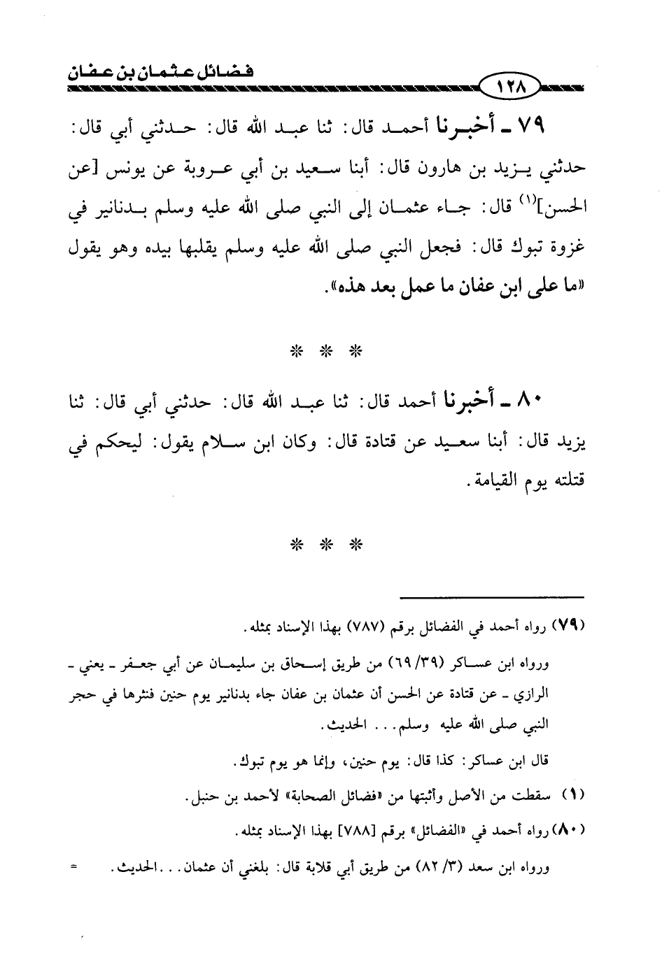 79 - حَدَّثَنِي أَبِي، قَالَ: حَدَّثَنِي يَزِيدُ بْنُ هَارُونَ، قَالَ: أبنا سَعِيدُ بْنُ أَبِي عَرُوبَةَ، عَنْ يُونُسَ، عَنِ الْحَسَنِ، قَالَ: جَاءَ عُثْمَانُ إِلَى النَّبِيِّ صَلَّى اللهُ عَلَيْهِ وَسَلَّمَ بِدَنَانِيرَ فِي غَزْوَةِ تَبُوكَ، قَالَ: فَجَعَلَ النَّبِيُّ صَلَّى اللهُ عَلَيْهِ وَسَلَّمَ يُقَلِّبُهَا بِيَدِهِ وَهُوَ يَقُولُ: «§مَا عَلَى ابْنِ عَفَّانَ مَا عَمِلَ بَعْدَ هَذِهِ»