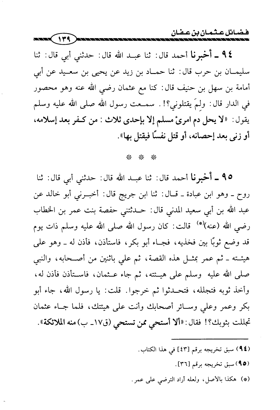 94 - حَدَّثَنِي أَبِي، قَالَ: ثنا سُلَيْمَانُ بْنُ حَرْبٍ، قَالَ: ثنا حَمَّادُ بْنُ زَيْدٍ، عَنْ يَحْيَى بْنِ سَعِيدٍ، عَنْ أَبِي أُمَامَةَ بْنِ سَهْلِ بْنِ حُنَيْفٍ، قَالَ: كُنَّا مَعَ عُثْمَانَ رَضِيَ اللَّهُ عَنْهُ وَهُوَ مَحْصُورٌ فِي الدَّارِ، قَالَ: " وَلِمَ يَقْتُلُونِي؟ سَمِعْتُ رَسُولَ اللَّهِ صَلَّى اللهُ عَلَيْهِ وَسَلَّمَ يَقُولُ: " §لَا يَحِلُّ دَمُ امْرِئٍ مُسْلِمٍ إِلَّا بِإِحْدَى ثَلَاثٍ: مَنْ كَفَرَ بَعْدَ إِسْلَامِهِ، أَوْ زَنَى بَعْدَ إِحْصَانِهِ، أَوْ قَتَلَ نَفْسًا فَيُقْتَلُ بِهَا "