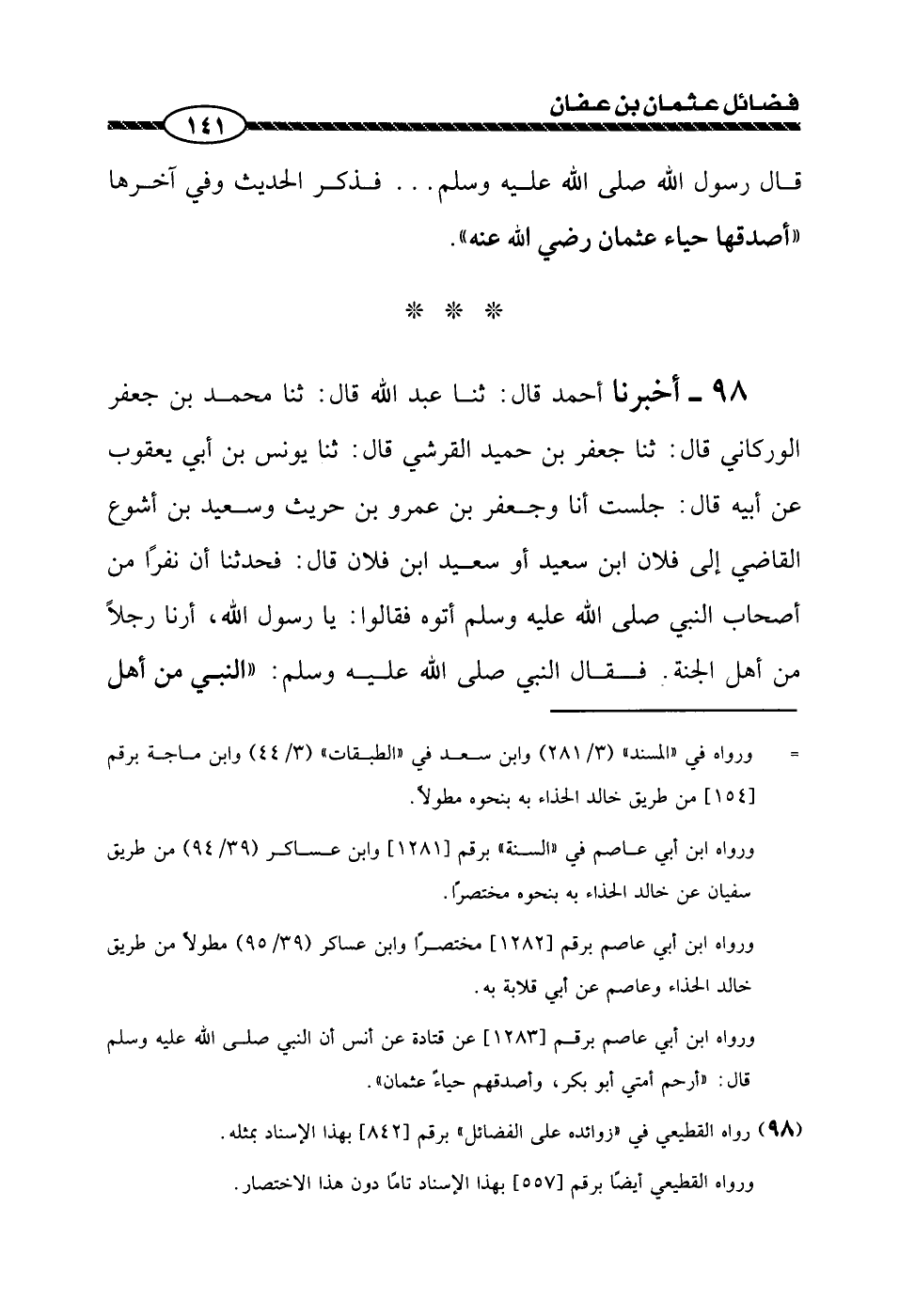 98 - ثنا عَبْدُ اللَّهِ قَالَ: ثنا مُحَمَّدُ بْنُ جَعْفَرٍ الْوَرْكَانِيُّ، قَالَ: ثنا جَعْفَرُ بْنُ حُمَيْدٍ الْقُرَشِيُّ، قَالَ: ثنا يُونُسُ بْنُ أَبِي يَعْفُورٍ، عَنْ أَبِيهِ، قَالَ: جَلَسْتُ أَنَا وَجَعْفَرُ بْنُ عَمْرِو بْنِ حُرَيْثٍ، وَسَعِيدُ بْنُ أَشْوَعَ الْقَاضِي، إِلَى فُلَانِ بْنِ سَعِيدٍ أَوْ سَعِيدِ بْنِ فُلَانٍ، قَالَ: فَحَدَّثَنَا، أَنَّ نَفَرًا مِنْ أَصْحَابِ النَّبِيِّ صَلَّى اللهُ عَلَيْهِ وَسَلَّمَ أَتَوْهُ فَقَالُوا: يَا رَسُولَ اللَّهِ، أَرِنَا رَجُلًا مِنْ أَهْلِ الْجَنَّةِ، فَقَالَ النَّبِيُّ صَلَّى اللهُ عَلَيْهِ وَسَلَّمَ: «§النَّبِيُّ مِنْ أَهْلِ -[142]- الْجَنَّةِ» . . . . فَذَكَرَ الْحَدِيثَ. وَقَالَ فِي آخِرِهِ: «وَعُثْمَانُ مِنْ أَهْلِ الْجَنَّةِ»