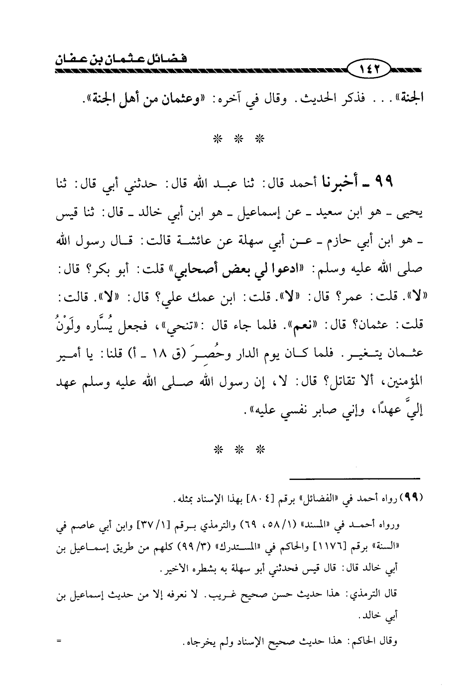 99 - حَدَّثَنِي أَبِي، قَالَ: ثنا يَحْيَى هُوَ ابْنُ سَعِيدٍ، عَنْ إِسْمَاعِيلَ هُوَ ابْنُ أَبِي خَالِدٍ قَالَ: ثنا قَيْسٌ هُوَ ابْنُ أَبِي حَازِمٍ، عَنْ أَبِي سَهْلَةَ، عَنْ عَائِشَةَ، قَالَتْ: قَالَ رَسُولُ اللَّهِ صَلَّى اللهُ عَلَيْهِ وَسَلَّمَ: «§ادْعُ لِي بَعْضَ أَصْحَابِي» قُلْتُ: أَبُو بَكْرٍ؟، قَالَ: «لَا» قُلْتُ: عُمَرُ؟ قَالَ: «لَا» قُلْتُ: ابْنُ عَمِّكَ عَلِيٌّ؟ قَالَ: «لَا» قَالَتْ: قُلْتُ عُثْمَانُ؟ قَالَ: «نَعَمْ» فَلَمَّا جَاءَ قَالَ: «تَنَحِّي» فَجَعَلَ يُسَارُّهُ وَلَوْنُ عُثْمَانَ يَتَغَيَّرُ. فَلَمَّا كَانَ يَوْمُ الدَّارِ وَحُصِرَ، قُلْنَا: يَا أَمِيرَ الْمُؤْمِنِينَ، أَلَا تُقَاتِلُ، قَالَ: لَا، إِنَّ رَسُولَ اللَّهِ صَلَّى اللهُ عَلَيْهِ وَسَلَّمَ عَهِدَ إِلَيَّ عَهْدًا، وَإِنِّي صَابِرٌ نَفْسِي عَلَيْهِ "