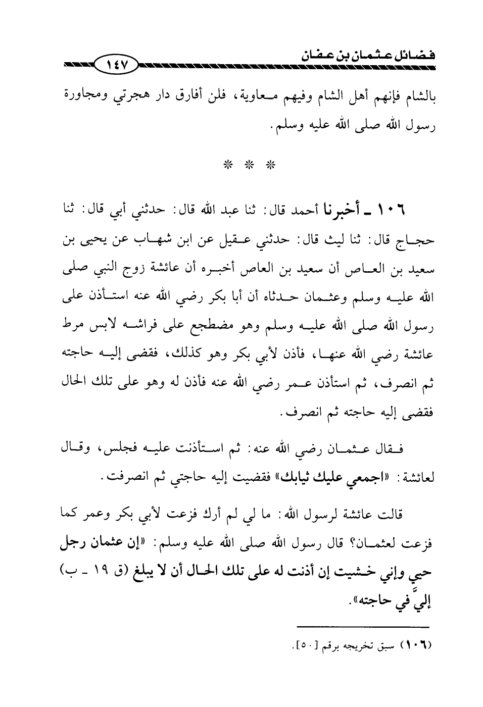 106 - حَدَّثَنِي أَبِي، قَالَ: ثنا حَجَّاجٌ، قَالَ: ثنا لَيْثٌ، قَالَ: حَدَّثَنِي عُقَيْلٌ، عَنِ ابْنِ شِهَابٍ، عَنْ يَحْيَى بْنِ سَعِيدِ بْنِ الْعَاصِ، أَنَّ سَعِيدَ بْنَ الْعَاصِ أَخْبَرَهُ، أَنَّ عَائِشَةَ زَوْجَ النَّبِيِّ صَلَّى اللهُ عَلَيْهِ وَسَلَّمَ، وَعُثْمَانَ حَدَّثَاهُ، أَنَّ أَبَا بَكْرٍ رَضِيَ اللَّهُ عَنْهُ اسْتَأْذَنَ عَلَى رَسُولِ اللَّهِ صَلَّى اللهُ عَلَيْهِ وَسَلَّمَ وَهُوَ مُضْطَجِعٌ عَلَى فِرَاشِهِ لَابِسٌ مِرْطَ عَائِشَةَ رَضِيَ اللَّهُ عَنْهَا، فَأَذِنَ لِأَبِي بَكْرٍ وَهُوَ كَذَلِكَ، فَقَضَى إِلَيْهِ حَاجَتَهُ ثُمَّ انْصَرَفَ، ثُمَّ اسْتَأْذَنَ عُمَرُ رَضِيَ اللَّهُ عَنْهُ فَأَذِنَ لَهُ وَهُوَ عَلَى تِلْكَ الْحَالِ فَقَضَى إِلَيْهِ حَاجَتَهُ ثُمَّ انْصَرَفَ. فَقَالَ عُثْمَانُ رَضِيَ اللَّهُ عَنْهُ: ثُمَّ اسْتَأْذَنْتُ عَلَيْهِ فَجَلَسَ، وَقَالَ لِعَائِشَةَ: «اجْمَعِي عَلَيْكِ ثِيَابَكِ» فَقَضَيْتُ إِلَيْهِ حَاجَتِي ثُمَّ انْصَرَفْتُ. قَالَتْ عَائِشَةُ لِرَسُولِ اللَّهِ: مَا لِي أَرَاكَ فَزِعْتَ لِأَبِي بَكْرٍ وَعُمَرَ كَمَا فَزِعْتَ لِعُثْمَانَ؟ قَالَ رَسُولُ اللَّهِ صَلَّى اللهُ عَلَيْهِ وَسَلَّمَ: «إِنَّ §عُثْمَانَ رَجُلٌ حَيِيٌّ، وَإِنِّي خَشِيتُ إِنْ أَذِنْتُ لَهُ عَلَى تِلْكَ الْحَالِ أَنْ لَا يُبْلِغَ إِلَيَّ فِي حَاجَتِهِ» . -[148]- وَقَالَ اللَّيْثُ: وَقَالَ جَمَاعَةٌ مِنَ النَّاسِ: إِنَّ رَسُولَ اللَّهِ صَلَّى اللهُ عَلَيْهِ وَسَلَّمَ قَالَ لِعَائِشَةَ: «أَلَا أَسْتَحِي مِمَّنْ تَسْتَحِي مِنْهُ الْمَلَائِكَةُ» .