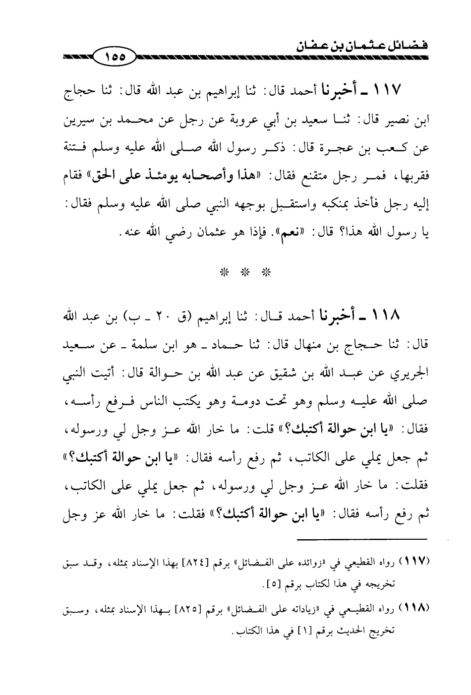 118 - ثنا إِبْرَاهِيمُ بْنُ عَبْدِ اللَّهِ، قَالَ: ثنا حَجَّاجُ بْنُ مِنْهَالٍ، قَالَ: ثنا حَمَّادٌ هُوَ ابْنُ سَلَمَةَ، عَنْ سَعِيدٍ الْجُرَيْرِيِّ، عَنْ عَبْدِ اللَّهِ بْنِ شَقِيقٍ، عَنْ عَبْدِ اللَّهِ بْنِ حَوَالَةَ، قَالَ: أَتَيْتُ النَّبِيَّ صَلَّى اللهُ عَلَيْهِ وَسَلَّمَ وَهُوَ تَحْتَ دُومَةٍ وَهُوَ يَكْتُبُ النَّاسَ، فَرَفَعَ رَأْسَهُ، فَقَالَ: «يَا ابْنَ حَوَالَةَ، أَكْتُبُكَ؟» قُلْتُ: مَا خَارَ اللَّهُ عَزَّ وَجَلَّ لِي وَرَسُولُهُ، ثُمَّ جَعَلَ يُمْلِي عَلَى الْكَاتِبِ، ثُمَّ رَفَعَ رَأْسَهُ فَقَالَ: «يَا ابْنَ حَوَالَةَ أَكْتُبُكَ؟» فَقُلْتُ: مَا خَارَ اللَّهُ عَزَّ وَجَلَّ لِي وَرَسُولُهُ، ثُمَّ جَعَلَ يُمْلِي عَلَى الْكَاتِبِ، ثُمَّ رَفَعَ رَأْسَهُ فَقَالَ: «يَا ابْنَ حَوَالَةَ أَكْتُبُكَ؟» فَقُلْتُ: مَا خَارَ اللَّهُ عَزَّ وَجَلَّ -[156]- لِي وَرَسُولُهُ، فَجَعَلَ يُمْلِي عَلَيَّ، فَنَظَرْتُ فِي الْكِتَابِ فَإِذَا فِيهِ أَبُو بَكْرٍ وَعُمَرُ رَضِيَ اللَّهُ عَنْهُمَا، فَعَلِمْتُ أَنَّهُمَا لَمْ يُكْتَبَا إِلَّا فِي خَيْرٍ قَالَ: «يَا ابْنَ حَوَالَةَ، أَكْتُبُكَ؟» فَقُلْتُ: نَعَمْ، ثُمَّ قَالَ: «يَا ابْنَ حَوَالَةَ، §كَيْفَ أَنْتَ وَفِتْنَةٌ تَكُونُ فِي أَقْطَارِ الْأَرْضِ كَأَنَّهَا صَيَاصِي بَقَرٍ، وَالَّتِي تَلِيهَا كَنَفْحَةِ أَرْنَبٍ؟» قُلْتُ: اللَّهُ وَرَسُولُهُ أَعْلَمُ. قَالَ: «فَإِنَّهُ يَوْمَئِذٍ وَمَنْ مَعَهُ عَلَى الْحَقِّ» فَذَهَبْتُ، فَلَقِيتُهُ، فَإِذَا هُوَ عُثْمَانُ بْنُ عَفَّانَ رَضِيَ اللَّهُ عَنْهُ. فَقُلْتُ: هَذَا يَا رَسُولَ اللَّهِ؟ قَالَ: «نَعَمْ» قَالَ: وَقَالَ ذَاتَ يَوْمٍ: «يَدْخُلُ عَلَيَّ رَجُلٌ مُعْتَجِرٌ بِبُرْدِ حِبَرَةٍ يُبَايِعُ اللَّهَ، مِنْ أَهْلِ الْجَنَّةِ» قَالَ: فَهَجَمْنَا عَلَى عُثْمَانَ وَهُوَ مُعْتَجِرٌ بُرْدَ حِبَرَةٍ يُبَايِعُ النَّاسَ