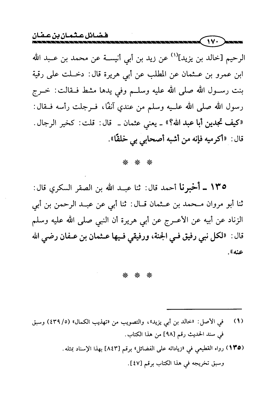 135 - ثنا عَبْدُ اللَّهِ بْنُ الصَّقْرِ السُّكَّرِيُّ، قَالَ: ثنا أَبُو مَرْوَانَ مُحَمَّدُ بْنُ عُثْمَانَ، قَالَ: ثنا أَبِي، عَنْ عَبْدِ الرَّحْمَنِ بْنِ أَبِي الزِّنَادِ، عَنْ أَبِيهِ، عَنِ الْأَعْرَجِ، عَنْ أَبِي هُرَيْرَةَ، أَنَّ النَّبِيَّ صَلَّى اللهُ عَلَيْهِ وَسَلَّمَ، قَالَ: «§لِكُلِّ نَبِيٍّ رَفِيقٌ فِي الْجَنَّةِ، وَرَفِيقِي فِيهَا عُثْمَانُ بْنُ عَفَّانَ» رَضِيَ اللَّهُ عَنْهُ "