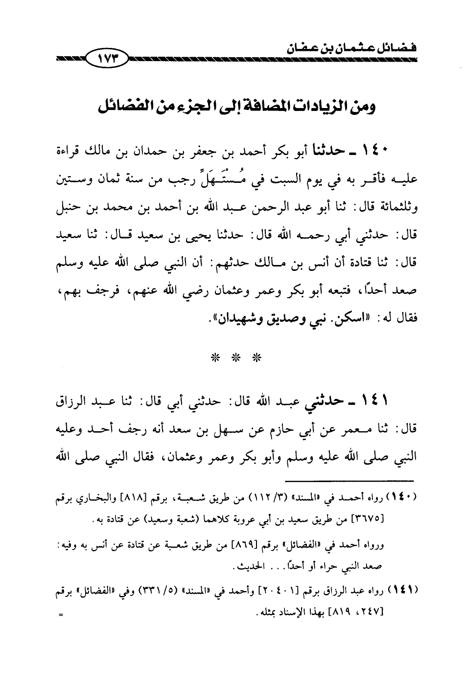 140 - حَدَّثَنَا أَبُو بَكْرٍ أَحْمَدُ بْنُ جَعْفَرِ بْنِ حَمْدَانَ بْنِ مَالِكٍ قِرَاءَةً عَلَيْهِ فَأَقَرَّ بِهِ فِي يَوْمِ السَّبْتِ فِي مُسْتَهَلِّ رَجَبٍ مِنْ سَنَةِ ثَمَانٍ وَسِتِّينَ وَثَلَاثِمِائَةٍ، قَالَ: ثنا أَبُو عَبْدِ الرَّحْمَنِ عَبْدُ اللَّهِ بْنُ أَحْمَدَ بْنِ مُحَمَّدِ بْنِ حَنْبَلٍ، قَالَ: حَدَّثَنِي أَبِي، رَحْمَهُ اللَّهُ، قَالَ: حَدَّثَنَا يَحْيَى بْنُ سَعِيدٍ، قَالَ: ثنا سَعِيدٌ، قَالَ: ثنا قَتَادَةُ، أَنَّ أَنَسَ بْنَ مَالِكٍ حَدَّثَهُمْ، أَنَّ النَّبِيَّ صَلَّى اللهُ عَلَيْهِ وَسَلَّمَ صَعِدَ أُحُدًا، فَتَبِعَهُ أَبُو بَكْرٍ وَعُمَرُ وَعُثْمَانُ رَضِيَ اللَّهُ عَنْهُمْ، فَرَجَفَ بِهِمْ فَقَالَ لَهُ: «§اسْكُنْ، نَبِيٌّ، وَصِدِّيقٌ، وَشَهِيدَانِ» ######