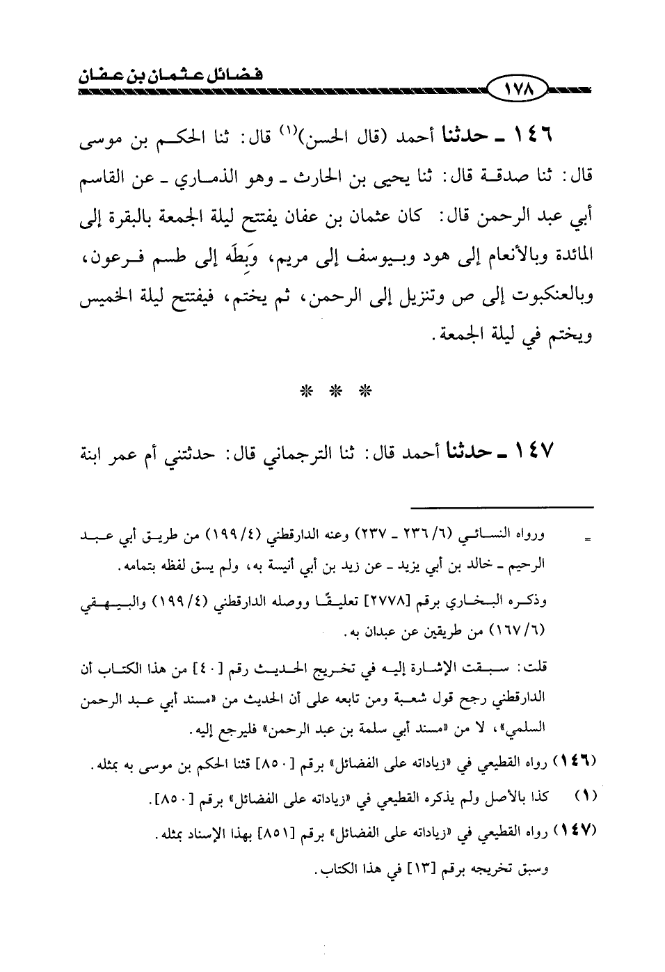 146 - قَالَ الْحَسَنُ، قَالَ: ثنا الْحَكَمُ بْنُ مُوسَى، قَالَ: ثنا صَدَقَةُ، قَالَ: ثنا يَحْيَى بْنُ الْحَارِثِ وَهُوَ الذِّمَارِيُّ، عَنِ الْقَاسِمِ أَبِي عَبْدِ الرَّحْمَنِ، قَالَ: " §كَانَ عُثْمَانُ بْنُ عَفَّانَ يَفْتَتِحُ لَيْلَةَ الْجُمُعَةِ بِالْبَقَرَةِ إِلَى الْمِائِدَةِ، وَبِالْأَنْعَامِ إِلَى هُودٍ، وَبِيُوسُفَ إِلَى مَرْيَمَ، وَبِطه إِلَى طسم فِرْعَوْنَ، وَبِالْعَنْكَبُوتِ إِلَى ص، وَتَنْزِيلَ إِلَى الرَّحْمَنِ، ثُمَّ يَخْتِمُ، فَيَفْتَحُ لَيْلَةَ الْخَمِيسِ، وَيَخْتِمُ فِي لَيْلَةِ الْجُمُعَةِ######