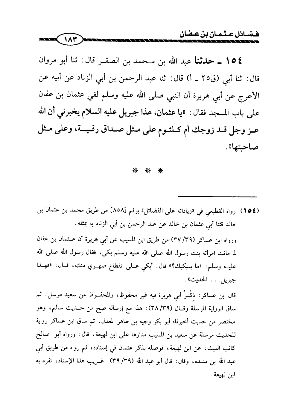 154 - حَدَّثَنَا عَبْدُ اللَّهِ بْنُ مُحَمَّدِ بْنِ الصَّقْرِ، قَالَ: ثنا أَبُو مَرْوَانَ، قَالَ: ثنا أَبِي، قَالَ: ثنا عَبْدُ الرَّحْمَنِ بْنُ أَبِي الزِّنَادِ، عَنْ أَبِيهِ، عَنِ الْأَعْرَجِ، عَنْ أَبِي هُرَيْرَةَ، أَنَّ النَّبِيَّ صَلَّى اللهُ عَلَيْهِ وَسَلَّمَ لَقِيَ عُثْمَانَ بْنَ عَفَّانَ عَلَى بَابِ الْمَسْجِدِ، فَقَالَ: «يَا عُثْمَانُ، §هَذَا جِبْرِيلُ عَلَيْهِ السَّلَامُ يُخْبِرُنِي أَنَّ اللَّهَ عَزَّ وَجَلَّ قَدْ زَوَّجَكَ أُمَّ كُلْثُومٍ عَلَى مِثْلِ صَدَاقِ رُقَيَّةَ، وَعَلَى مِثْلِ صَاحِبَتِهَا» ######