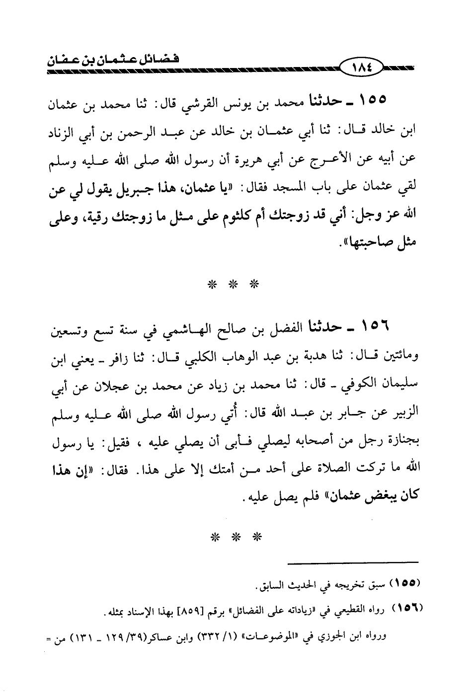 156 - حَدَّثَنَا الْفَضْلُ بْنُ صَالِحٍ الْهَاشِمِيُّ، فِي سَنَةِ تِسْعٍ وَتِسْعِينَ وَمِائَتَيْنِ، قَالَ: ثنا هَدِيَّةُ بْنُ عَبْدِ الْوَهَّابِ الْكَلْبِيُّ قَالَ: ثنا زَافِرٌ يَعْنِي ابْنَ سُلَيْمَانَ الْكُوفِيَّ، قَالَ: ثنا مُحَمَّدُ بْنُ زِيَادٍ، عَنْ مُحَمَّدِ بْنِ عَجْلَانَ، عَنْ أَبِي الزُّبَيْرِ، عَنْ جَابِرِ بْنِ عَبْدِ اللَّهِ قَالَ: أُتِيَ رَسُولُ اللَّهِ صَلَّى اللهُ عَلَيْهِ وَسَلَّمَ بِجِنَازَةِ رَجُلٍ مِنْ أَصْحَابِهِ لِيُصَلِّيَ فَأَبَى أَنْ يُصَلِّيَ عَلَيْهِ، فَقِيلَ: يَا رَسُولَ اللَّهِ مَا تَرَكْتَ الصَّلَاةَ عَلَى أَحَدٍ مِنْ أُمَّتِكَ إِلَّا عَلَى هَذَا. فَقَالَ: «§إِنَّ هَذَا كَانَ يُبْغِضُ عُثْمَانَ» فَلَمْ يُصَلِّ عَلَيْهِ######