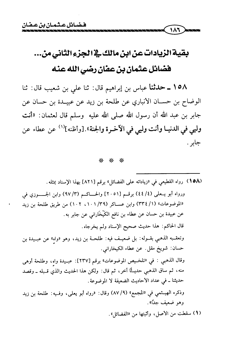 158 - حَدَّثَنَا عَبَّاسُ بْنُ إِبْرَاهِيمَ، قَالَ: ثنا عَلِيُّ بْنُ شُعَيْبٍ، قَالَ: ثنا الْوَضَّاحُ بْنُ حَسَّانَ الْأَنْبَارِيُّ، عَنْ طَلْحَةَ بْنِ زَيْدٍ، عَنْ عُبَيْدَةَ بْنِ حَسَّانَ، عَنْ جَابِرِ بْنِ عَبْدِ اللَّهِ، أَنَّ رَسُولَ اللَّهِ صَلَّى اللهُ عَلَيْهِ وَسَلَّمَ قَالَ لِعُثْمَانَ: «§أَنْتَ وَلِيِّي فِي الدُّنْيَا، وَأَنْتَ وَلِيِّي فِي الْآخِرَةِ وَالْجَنَّةِ» . وَأَظُنُّهُ عَنْ عَطَاءٍ، عَنْ جَابِرٍ######