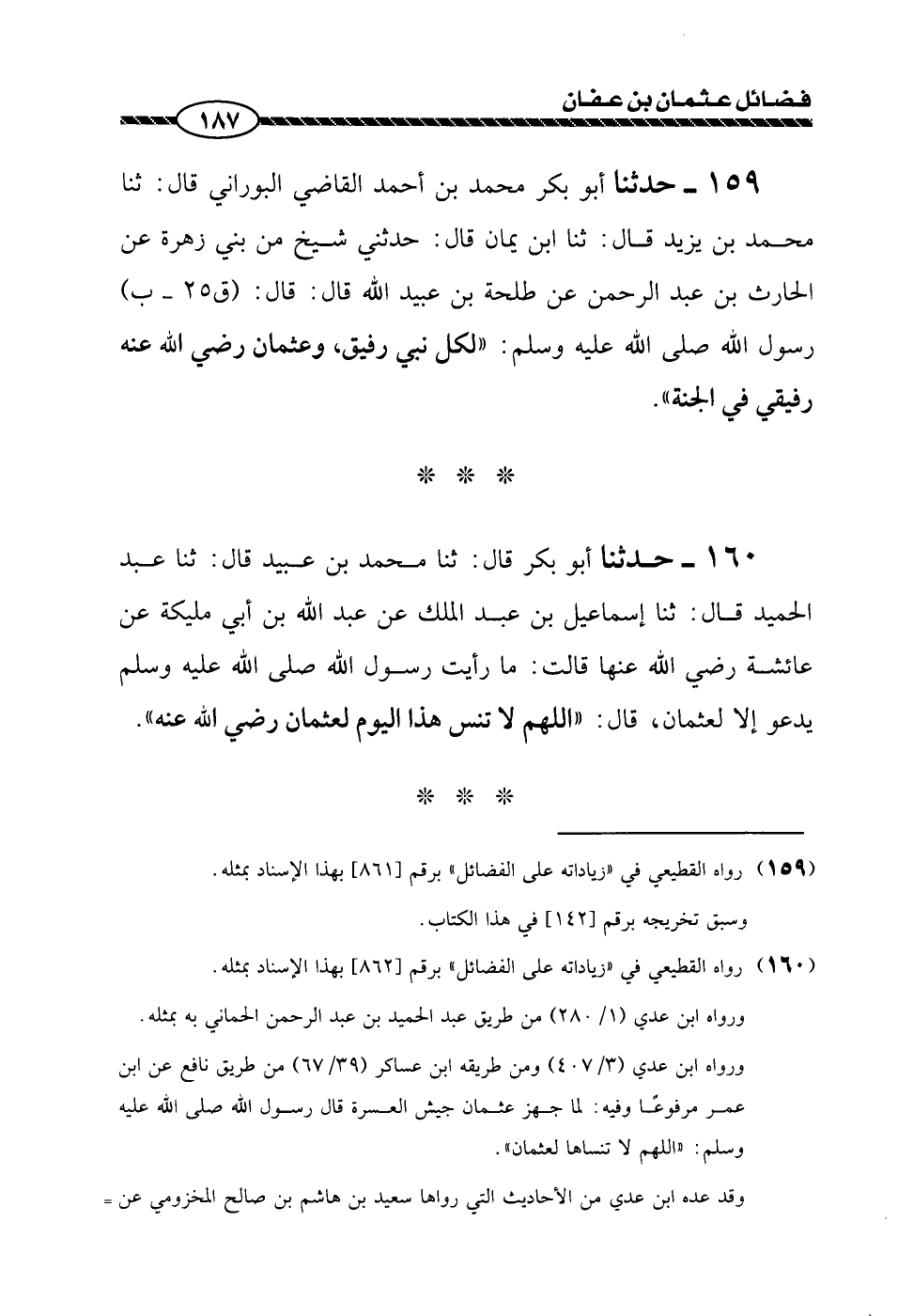 159 - حَدَّثَنَا أَبُو بَكْرٍ مُحَمَّدُ بْنُ أَحْمَدَ الْقَاضِي الْبُورَانِيُّ قَالَ: ثنا مُحَمَّدُ بْنُ يَزِيدَ، قَالَ: ثنا ابْنُ يَمَانٍ، قَالَ: حَدَّثَنِي شَيْخٌ مِنْ بَنِي زُهْرَةَ، عَنِ الْحَارِثِ بْنِ عَبْدِ الرَّحْمَنِ، عَنْ طَلْحَةَ بْنِ عُبَيْدِ اللَّهِ، قَالَ: قَالَ رَسُولُ اللَّهِ صَلَّى اللهُ عَلَيْهِ وَسَلَّمَ: «§لِكُلِّ نَبِيٍّ رَفِيقٌ، وَعُثْمَانُ رَضِيَ اللَّهُ عَنْهُ رَفِيقِي فِي الْجَنَّةِ» ######
