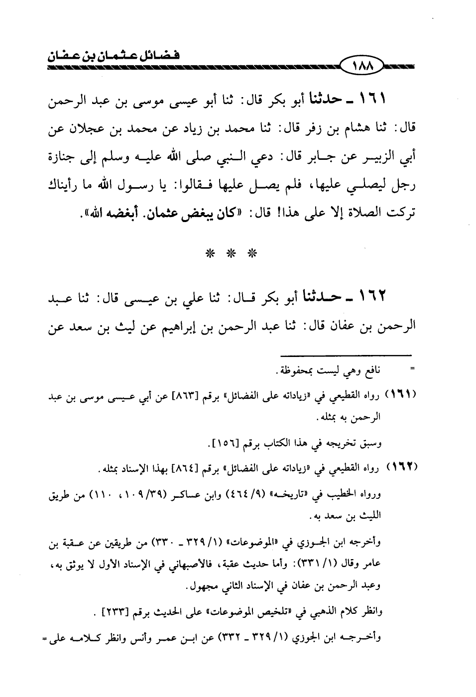 161 - حَدَّثَنَا أَبُو بَكْرٍ، قَالَ: ثنا أَبُو عِيسَى مُوسَى بْنُ عَبْدِ الرَّحْمَنِ، قَالَ: ثنا عُثْمَانُ بْنُ زُفَرَ، قَالَ: ثنا مُحَمَّدُ بْنُ زِيَادٍ، عَنْ مُحَمَّدِ بْنِ عَجْلَانَ، عَنْ أَبِي الزُّبَيْرِ، عَنْ جَابِرٍ، قَالَ: دُعِيَ النَّبِيُّ صَلَّى اللهُ عَلَيْهِ وَسَلَّمَ إِلَى جَنَازَةِ رَجُلٍ لِيُصَلِّيَ عَلَيْهَا، فَلَمْ يُصَلِّ عَلَيْهَا فَقَالُوا: يَا رَسُولَ اللَّهِ مَا رَأَيْنَاكَ تَرَكْتَ الصَّلَاةَ إِلَّا عَلَى هَذَا قَالَ: «§كَانَ يُبْغِضُ عُثْمَانَ، أَبْغَضَهُ اللَّهُ» ######