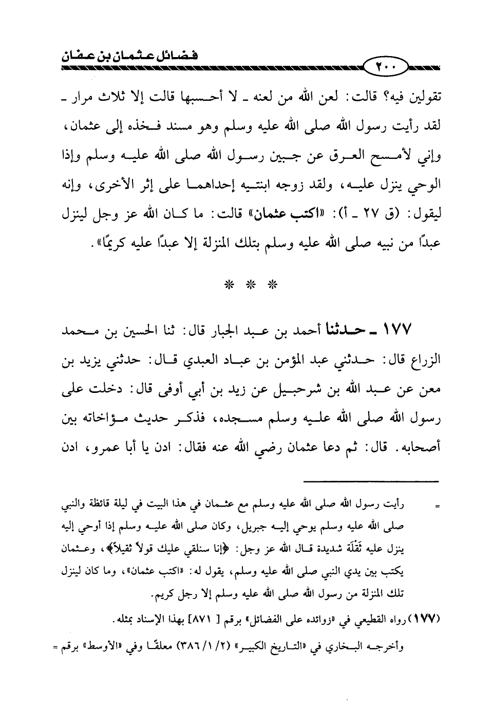 177 - حَدَّثَنَا أَحْمَدُ بْنُ عَبْدِ الْجَبَّارِ، قَالَ: ثنا الْحَسَنُ بْنُ مُحَمَّدٍ الذَّارِعُ، قَالَ: حَدَّثَنِي عَبْدُ الْمُؤْمِنِ بْنُ عَبَّادٍ الْعَبْدِيُّ، قَالَ: حَدَّثَنِي يَزِيدُ بْنُ مَعْنٍ، عَنْ عَبْدِ اللَّهِ بْنِ شُرَحْبِيلَ، عَنْ زَيْدِ بْنِ أَبِي أَوْفَى، قَالَ: دَخَلْتُ عَلَى رَسُولِ اللَّهِ صَلَّى اللهُ عَلَيْهِ وَسَلَّمَ مَسْجِدَهُ، فَذَكَرَ حَدِيثَ مُؤَاخَاتِهِ بَيْنَ أَصْحَابِهِ، قَالَ: ثُمَّ دَعَا عُثْمَانَ رَضِيَ اللَّهُ عَنْهُ فَقَالَ: «ادْنُ يَا أَبَا عَمْرٍو، ادْنُ -[201]- يَا أَبَا عَمْرٍو» فَلَمْ يَزَلْ يَدْنُو حَتَّى أَلْصَقَ رُكْبَتَيْهِ بِرُكْبَتِهِ، فَنَظَرَ رَسُولُ اللَّهِ صَلَّى اللهُ عَلَيْهِ وَسَلَّمَ إِلَى السَّمَاءِ فَقَالَ: «سُبْحَانَ اللَّهِ الْعَظِيمِ» ثَلَاثَ مَرَّاتٍ، ثُمَّ نَظَرَ إِلَى عُثْمَانَ وَكَانَتْ أَزْرَارُهُ مَحْلُولَةً، فَرَدَّهَا رَسُولُ اللَّهِ صَلَّى اللهُ عَلَيْهِ وَسَلَّمَ -[202]- بِيَدِهِ، ثُمَّ قَالَ: «اجْمَعْ عِطْفَيْ رِدَائِكَ عَلَى نَحْرِكَ» ثُمَّ قَالَ: " إِنَّ لَكَ شَأْنًا فِي أَهْلِ السَّمَاءِ، وَأَنْتَ مِمَّنْ يَرِدُ عَلَيَّ الْحَوْضَ، وَأَوْدَاجُكَ تَشْخَبُ دَمًا فَأَقُولُ: مَنْ فَعَلَ بِكَ هَذَا؟ فَيَقُولُ: فُلَانٌ وَفُلَانٌ " ذَلِكَ كَلَامُ جِبْرِيلَ عَلَيْهِ السَّلَامُ، إِذَا هَاتِفٌ يَهْتِفُ مِنَ السَّمَاءِ، فَقَالَ: أَلَا إِنَّ §عُثْمَانَ أَمِيرٌ عَلَى كُلِّ مَخْذُولٍ "، ثُمَّ تَنَحَّى عُثْمَانُ رَضِيَ اللَّهُ عَنْهُ######