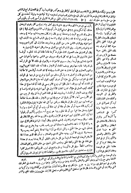 قَالَ أَبُو مُحَمَّد فِي هَذِه الْفُصُول ثَلَاث طوام نذكرها طامة طامة إِن شَاءَ الله تَعَالَى أَولهَا اتِّفَاق الأناجيل الْأَرْبَعَة على أَنه كَانَ لَهُ وَالِد مَعْرُوف من النَّاس وإخوة وأخوات سمى الْإِخْوَة بِأَسْمَائِهِمْ وهم أَرْبَعَة رجال سوى الْأَخَوَات وَلَا يعول فِي ذَلِك إِلَّا على إِقْرَار أمه بِأَن لَهُ والداً طلبه مَعهَا وَهُوَ يُوسُف الْحداد أَو النجار فَأَما أمه فقد اتفقنا نَحن وَالْيَهُود وَجُمْهُور النَّصَارَى على أَنَّهَا حملت بِهِ حمل النِّسَاء وولدته كَمَا تَلد النِّسَاء أَوْلَادهنَّ إِلَّا طَائِفَة من النَّصَارَى قَالَت لم تحمل بِهِ وَلَكِن دخل من أذنها وَخرج من فرجهَا فِي الْوَقْت كَالْمَاءِ فِي الْمِيزَاب وَلَكِن بَقِي علينا أَن نَعْرِف كَيفَ تَقول أمه عَلَيْهَا السَّلَام عَن النجار أَو الْحداد أَنه أَبوهُ ووالده فَإِن قَالُوا إِن زوج الْأُم يُسمى فِي اللُّغَة أَبَا قُلْنَا هبكم أَن هَذَا كَذَلِك كَيفَ الْعَمَل فِي هَؤُلَاءِ الَّذين اتّفقت الأناجيل على أَنهم إخْوَته وأخواته وَإِنَّمَا هم أَوْلَاد يُوسُف النجار أَو الْحداد وَمَا وجد قطّ فِي اللُّغَة العبرانية أَن ولد الربيب من غير الْأُم يُسمى أَخا إِلَّا أَن يَقُولُوا إِن مَرْيَم ولدتهم من النجار فقد قَالَ هَذَا طَائِفَة من قدمائهم مِنْهُم يليان مطران طليطلة وَنحن نبرأ إِلَى الله تَعَالَى مِمَّا يَقُول هَؤُلَاءِ الْكَفَرَة أَن يكون لآله معبود أم أَو خَال أَو خَاله أَو ابْن خَالَة أَو ربيب أَو أَخ أَو أُخْت وتباً لعقول يدْخل هَذَا فِيهَا من أَن لله تَعَالَى ربيباً هُوَ زوج أمه وَلَيْسَ يُمكنهُم أَن يَقُولُوا إِنَّمَا أَرَادَ كتاب الْإِنْجِيل أَنهم إخْوَته فِي الْإِيمَان وَالدّين لِأَن يوحنا قد رفع الْإِشْكَال فِي ذَلِك وَقَالَ وَمَعَهُ إخْوَته وتلاميذه فجعلهم طبقتين وَقَالَ أَيْضا إِن إخْوَته كَانُوا لَا يُؤمنُونَ بِهِ وتالله لَوْلَا أَنا شاهدنا النَّصَارَى مَا صدقنا أَن من يلْعَب بقذره وَمَا يخرج من سفله يصدق بِشَيْء من هَذَا الْحمق وَلَكِن تبَارك من أرانا بِهَذَا أَنه لَا ينْتَفع أحد ببصره وَلَا بسمعه وَلَا بتمييزه إِلَّا أَن يهديه خَالق الْهدى والضلال نسْأَل الله الَّذِي هدَانَا لملة الْإِسْلَام الْبَيْضَاء الْوَاضِحَة السليمة من كل مَا ينافره الْعقل أَن لَا يضلنا بعد إِذْ هدَانَا حَتَّى نَلْقَاهُ على مِلَّة الْحق ونحلة الْحق وَمذهب الْحق ناجين من خلل الْكفْر وَنحل الضلال ومذاهب الْخَطَأ وَفِي كل مَا أوردناه بَيَان وَاضح فِي أَن الَّذين ألفوا الأناجيل كَانُوا عيارين مستخفين بِمن أضلوه متلاعبين بِالدّينِ والطامة الثَّانِيَة إقرارهم بِأَن الْمَسِيح لم يكن