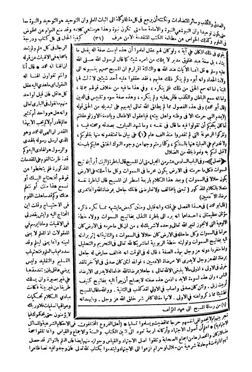 قَالَ أَبُو مُحَمَّد فِي هَذَا الْفَصْل على قلته وَأَنه قَلِيل ومنتن كبعض مَا يُشبههُ مِمَّا نكره ذكره سؤتان عظيمتان إِحْدَاهمَا أَنه برْء إِلَى باطرة النذل بمفاتيح السَّمَوَات وولاه خطة الألوهية الَّتِي لَا تجوز لغير الله تَعَالَى وَحده لَا شريك لَهُ من أَن كل مَا حرمه فِي الأَرْض كَانَ حَرَامًا فِي السَّمَوَات وكل مَا حلله فِي الأَرْض كَانَ حَلَال فِي السَّمَوَات وَالثَّانيَِة أَنه إِثْر بَرَاءَته إِلَيْهِ بمفاتيح السَّمَوَات وتوليته خطة الربوبية إِمَّا شَرِيكا لله تَعَالَى فِي التَّحْرِيم والتحليل وَإِمَّا مُنْفَردا دونه عز وَجل بِهَذِهِ الصّفة قَالَ لَهُ فِي الْوَقْت أَنه مُخَالف معَارض لَهُ جَاهِل بمرضاة الله عز وَجل لَا يدْرِي إِلَّا مرضاة الْآدَمِيّين فوَاللَّه لَئِن كَانَ صدق فِي الْآخِرَة لقد خرق فِي الأولى إِذْ ولي مَا لَا يَنْبَغِي إِلَّا لله تَعَالَى جَاهِلا بمرضاة الله مُخَالفا لَهُ لَا يدْرِي إِلَّا رِضَاء النَّاس وَأَن هَذِه لسوءة الْأَبَد إِذْ من هَذِه صفته لَا يصلح أَن يبرأ إِلَيْهِ بمفاتيح كنيف أَو بَيت زبل وَلَئِن كَانَ صدق وَأصَاب فِي الأولى لقد كذب فِي الثَّانِيَة وَوَاللَّه مَا قَالَ الْمَسِيح قطّ شَيْئا مِمَّا ذكرُوا عَنهُ فِي الأولى لِأَنَّهَا مقَالَة كَافِر شَرّ خلق الله عز وَجل وَمَا يبعد أَنه
