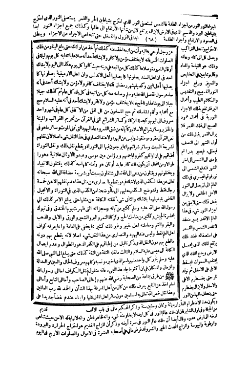 عز وَجل أوحى بِهِ إِلَيْهِ وَأَن من اتبعهُ أَخذه عَنهُ كَذَلِك ثمَّ أَخذ عَن أُولَئِكَ حَتَّى بلغ إِلَيْنَا وَمن ذَلِك الصَّلَوَات الْخمس فَإِنَّهُ لَا يخْتَلف مُؤمن وَلَا كَافِر وَلَا يشك أحد أَنه صلاهَا بِأَصْحَابِهِ كل يَوْم وَلَيْلَة فِي أَوْقَاتهَا الْمَعْهُودَة وصلاها كَذَلِك كل من اتبعهُ على دينه حَيْثُ كَانُوا كل يَوْم هَكَذَا إِلَى الْيَوْم لَا يشك أحد فِي أَن أهل السَّنَد يصلونها كَمَا يُصليهَا أهل الأندلس وَأَن أهل الأرمنية يصلونها كَمَا يُصليهَا أهل الْيمن وكصيام شهر رَمَضَان فَإِنَّهُ لَا يخْتَلف كَافِر وَلَا مُؤمن وَلَا يشك أحد فِي أَنه صَامَهُ رَسُول الله صلى الله عَلَيْهِ وَسلم وصامه مَعَه كل من اتبعهُ فِي كل بلد كل عَام ثمَّ كَذَلِك جيلاً جيلاً إِلَى يَوْمنَا هَذَا وكالحج فَإِنَّهُ لَا يخْتَلف مُؤمن وَلَا كَافِر وَلَا يشك أحد فِي أَنه عَلَيْهِ السَّلَام حج مَعَ أَصْحَابه وَأقَام الْمَنَاسِك ثمَّ حج الْمُسلمُونَ من كل أفق من إِلَّا فاق كل عَام فِي شهر وَاحِد مَعْرُوف إِلَى الْيَوْم وكجملة الزَّكَاة وكسائر الشَّرَائِع الَّتِي فِي الْقُرْآن من تَحْرِيم القرائب وَالْميتَة وَالْخِنْزِير وَسَائِر شرائع الْإِسْلَام وكآياته من شقّ الْقَمَر وَدُعَاء الْيَهُود الَّتِي تمنى الْمَوْت وَسَائِر مَا هُوَ فِي نَص الْقُرْآن مقروء ومنقول وَلَيْسَ عَن الْيَهُود وَلَا عِنْد النَّصَارَى فِي هَذَا النَّقْل شَيْء أصلا لِأَن نقلهم لشريعة السبت وَسَائِر شرائعهم إِنَّمَا يرجعُونَ فِيهَا إِلَى التَّوْرَاة وَيقطع نقل ذَلِك وَنقل التَّوْرَاة إطباقهم على أَن أوائلهم كفرُوا بأجمعهم وبرؤا من دين مُوسَى وعبدوا الْأَوْثَان عَلَانيَة دهوراً طوَالًا وَمن الْمحَال أَن يكون ملك كَافِر عَابِد أوثان هُوَ وَأمته كلهَا مَعَه كَذَلِك يقتلُون الْأَنْبِيَاء ويخنقونهم وَيقْتلُونَ من دعى إِلَى الله تَعَالَى يشتغلون بِسَبَب أَو بشريعة مُضَافَة إِلَى الله سُبْحَانَهُ تَعَالَى عَن هَذَا الْكَذِب الَّذِي لَا شكّ فِيهِ وَيقطع بالنصارى عَن مثل هَذَا عدم نقلهم إِلَّا عَن خَمْسَة رجال فَقَط وَقد وضح الْكَذِب عَلَيْهِم إِلَى مَا أوضحنا من الْكَذِب الَّذِي فِي التَّوْرَاة وَالْإِنْجِيل القَاضِي بتبديلهما بِلَا شكّ وَالثَّانِي شء نقلته الكافة عَن مثلهَا حَتَّى يبلغ الْأَمر كَذَلِك إِلَى رَسُول الله صلى الله عَلَيْهِ وَسلم ككثير من آيَاته ومعجزاته الَّتِي ظَهرت يَوْم الخَنْدَق وَفِي تَبُوك بِحَضْرَة الْجَيْش وككثير من مَنَاسِك الْحَج وكزكاة التَّمْر وَالْبر وَالشعِير وَالْوَرق وَالْإِبِل وَالذَّهَب وَالْبَقر وَالْغنم ومعاملته أهل خَيْبَر وَغير ذَلِك مِمَّا يخفى على الْعَامَّة وَإِنَّمَا يعرفهُ كواف أهل الْعلم فَقَط وَلَيْسَ عِنْد الْيَهُود وَالنَّصَارَى من هَذَا لنقل شَيْء أصلا لِأَنَّهُ يقطع بهم دونه وَمَا قطع بهم دون النَّقْل الَّذِي ذكرنَا قبل من أطباقهم على الْكفْر الدهور الطوَال وَعدم إِيصَال الكافة إِلَى عِيسَى عَلَيْهِ السَّلَام وَالثَّالِث مَا نَقله الثِّقَة عَن الثِّقَة كَذَلِك حَتَّى يبلغ إِلَى النَّبِي صلى الله عَلَيْهِ وَسلم يخبر كل وَاحِد مِنْهُم باسم الَّذِي أخبرهُ وَنسبه وَكلهمْ مَعْرُوف الْحَال وَالْعين وَالْعَدَالَة وَالزَّمَان وَالْمَكَان على أَن أَكثر مَا جَاءَ هَذَا الْمَجِيء فَإِنَّهُ مَنْقُول نقل الكواف إِمَّا إِلَى رَسُول الله صلى الله عَلَيْهِ وَسلم من طرق جمَاعَة من الصَّحَابَة رَضِي الله عَنْهُم وَإِمَّا إِلَى الصاحب وَإِمَّا إِلَى التَّابِع وَإِمَّا إِلَى أَمَام أَخذ عَن التَّابِع يعرف ذَلِك من كَانَ من أهل الْمعرفَة بِهَذَا الشَّأْن وَالْحَمْد لله رب الْعَالمين وَهَذَا نقل خص الله تَعَالَى بِهِ المسملين دون سَائِر أهل الْملَل كلهَا وبناه عِنْدهم غضاً جَدِيدا على