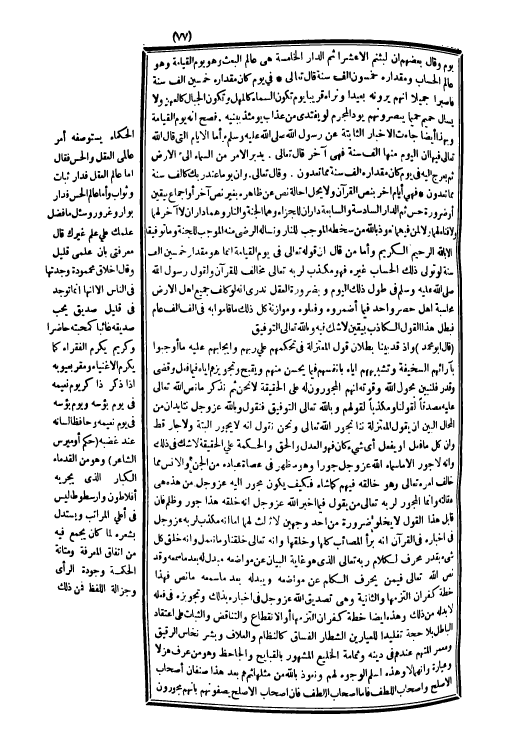 يَوْم وَقَالَ بَعضهم إِن لبثتم إِلَّا عشرا ثمَّ الدَّار الْخَامِسَة هِيَ عَالم الْبَعْث وَهُوَ يَوْم الْقِيَامَة وَهُوَ عَالم الْحساب ومقداره خَمْسُونَ ألف سنة قَالَ تَعَالَى {فِي يَوْم كَانَ مِقْدَاره خمسين ألف سنة فاصبر صبرا جميلاً أَنهم يرونه بَعيدا ونراه قَرِيبا يَوْم تكون السَّمَاء كَالْمهْلِ وَتَكون الْجبَال كالعهن وَلَا يسْأَل حميم حميماً يبصرونهم يود المجرم لَو يفتدي من عَذَاب يَوْمئِذٍ ببنيه} فصح أَنه يَوْم الْقِيَامَة وَبِهَذَا أَيْضا جَاءَت الْأَخْبَار الثَّابِتَة عَن رَسُول الله صلى الله عَلَيْهِ وَسلم وَأما الْأَيَّام الَّتِي قَالَ الله تَعَالَى فِيهَا أَن الْيَوْم مِنْهَا ألف سنة فَهِيَ آخر قَالَ تَعَالَى {يدبر الْأَمر من السَّمَاء إِلَى الأَرْض ثمَّ يعرج إِلَيْهِ فِي يَوْم كَانَ مِقْدَاره ألف سنة مِمَّا تَعدونَ} وَقَالَ تَعَالَى {وَإِن يَوْمًا عِنْد رَبك كألف سنة مِمَّا تَعدونَ} فَهِيَ أَيَّام أخر بِنَصّ الْقُرْآن وَلَا يحل إِحَالَة نَص عَن ظَاهره بِغَيْر نَص آخر أَو إِجْمَاع بِيَقِين أَو ضَرُورَة حس ثمَّ الدَّار السَّادِسَة وَالسَّابِعَة داران للجزاء وهما الْجنَّة وَالنَّار وهما داران لَا آخر لَهما وَلَا فنَاء لَهما وَلَا لمن فيهمَا نَعُوذ بِاللَّه من سخطه الْمُوجب للنار ونسأله الرضى مِنْهُ الْمُوجب للجنة وَمَا تَوْفِيقًا إِلَّا بِاللَّه الرَّحِيم الْكَرِيم وَأما من قَالَ أَن قَوْله تَعَالَى فِي يَوْم الْقِيَامَة إِنَّمَا هُوَ مِقْدَار خمسين ألف سنة لَو تولى ذَلِك الْحساب غَيره فَهُوَ مكذب لرَبه تَعَالَى مُخَالف لِلْقُرْآنِ وَلقَوْل رَسُول الله صلى الله عَلَيْهِ وَسلم فِي طول ذَلِك الْيَوْم وبضرورة الْعقل نَدْرِي أَنه لَو كلف جَمِيع أهل الأَرْض محاسبة أهل حصروا وَاحِد فِيمَا أضمروه وفعلوه وموازنة كل ذَلِك مَا قَامُوا بِهِ فِي ألف ألف عَام فَبَطل هَذَا القَوْل الْكَاذِب بِيَقِين لَا شكّ فِيهِ وَبِاللَّهِ تَعَالَى التَّوْفِيق