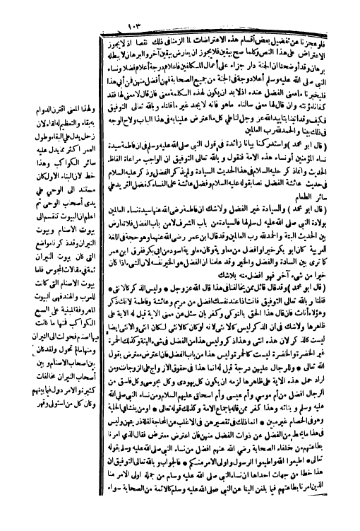 (قَالَ أَبُو مُحَمَّد) وَقد قَالَ قَائِل مِمَّن يخالفنا فِي هَذَا قَالَ الله عز وَجل {وَلَيْسَ الذّكر كالانثى} فَقُلْنَا وَبِاللَّهِ تَعَالَى التَّوْفِيق فَأَنت إِذا عِنْد نَفسك أفضل من مَرْيَم وَعَائِشَة وَفَاطِمَة لِأَنَّك ذكر وَهَؤُلَاء أناث فَإِن قَالَ هَذَا الْحق بالنوكي وَكفر بِأَن سُئِلَ عَن معنى الْآيَة قيل لَهُ الْآيَة على ظَاهرهَا وَلَا شكّ فِي أَن الذّكر لَيْسَ كالأنثى لِأَنَّهُ لَو كَانَ كالأنثى وَالْأُنْثَى أَيْضا لَيست كالذكر لِأَن هَذِه أُنْثَى وَهَذَا ذكر وَلَيْسَ هَذَا من الْفضل فِي شَيْء الْبَتَّةَ وَكَذَلِكَ الْحمرَة غير الخضرة والخضرة لَيست كالحمرة وَلَيْسَ هَذَا من بَاب الْفضل فَإِن اعْترض معترض بقول الله تَعَالَى {وللرجال عَلَيْهِنَّ دَرَجَة} قيل لَهُ إِنَّمَا هَذَا فِي حُقُوق الْأزْوَاج على الزَّوْجَات وَمن أَرَادَ حمل هَذِه الْآيَة على ظَاهرهَا لزمَه أَن يكون كل يَهُودِيّ وكل مَجُوسِيّ وكل فَاسق من الرِّجَال أفضل من أم مُوسَى وَأم عِيسَى وَأم إِسْحَاق عَلَيْهِم السَّلَام وَمن نسَاء النَّبِي صلى الله عَلَيْهِ وَسلم وَبنَاته وهذ 1 كفر مِمَّن قَالَه بِإِجْمَاع الْأمة وَكَذَلِكَ قَوْله تَعَالَى {أَو من ينشأ فِي الْحِلْية وَهُوَ فِي الْخِصَام غير مُبين} إِنَّمَا لَك فِي تقصيرهن فِي الْأَغْلَب عَن المحاجة لقلَّة ذريتهن وَلَيْسَ فِي هَذَا مَا يحط من الْفضل عَن ذَوَات الْفضل مِنْهُنَّ فَإِن اعْترض معترض فَقَالَ الَّذِي أمرنَا بطاعتهم من خلفاء الصَّحَابَة رَضِي الله عَنْهُم أفضل من نسَاء النَّبِي صلى الله عَلَيْهِ وَسلم بقوله تَعَالَى {أطِيعُوا الله وَأَطيعُوا الرَّسُول وأولي الْأَمر مِنْكُم} فَالْجَوَاب وَبِاللَّهِ تَعَالَى التَّوْفِيق إِن هَذَا خطأ من جِهَات إِحْدَاهَا أَن نسَاء النَّبِي صلى الله عَلَيْهِ وَسلم من جملَة أولي الْأَمر منا الَّذين أمرنَا بطاعتهم فِيمَا بلغن إِلَيْنَا عَن النَّبِي صلى الله عَلَيْهِ وَسلم كالأئمة من الصَّحَابَة سَوَاء