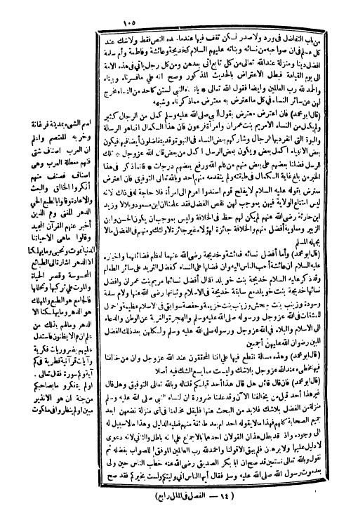 (قَالَ أَبُو مُحَمَّد) فَإِن قَالَ قَائِل هَل قَالَ هَذَا أحكم قبلكُمْ قُلْنَا لَهُ وَبِاللَّهِ تَعَالَى التَّوْفِيق وَهل قَالَ غير هَذَا أحد قبل من يخالفنا الْآن وَقد علمنَا ضَرُورَة أَن لِنسَاء النَّبِي صلى الله عَلَيْهِ وَسلم منزلَة من الْفضل بِلَا شكّ فَلَا بُد من الْبَحْث عَنْهَا فَلْيقل مخالفنا فِي أَي منزلَة نضعهن أبعد جَمِيع الصَّحَابَة كلهم فَهَذَا مَالا يَقُوله أحد أم بعد طَائِفَة مِنْهُم فَعَلَيهِ الدَّلِيل وَهَذَا مَا لَا سَبِيل لَهُ إِلَى وجوده وَإِذ قد بَطل هَذَانِ الْقَوْلَانِ أَحدهمَا بِالْإِجْمَاع على أَنه بَاطِل وَالثَّانِي لِأَنَّهُ دَعْوَى لَا دَلِيل عَلَيْهَا وَلَا برهَان فَلم يبْق إِلَّا قَوْلنَا وَالْحَمْد لله رب الْعَالمين الْمُوفق للصَّوَاب بفضله ثمَّ نقُول وَبِاللَّهِ تَعَالَى نستعين قد صَحَّ أَن أَبَا بكر الصّديق رَضِي الله عَنهُ خطب النَّاس حِين ولي بعد موت رَسُول الله صلى الله عَلَيْهِ وَسلم فَقَالَ أَيهَا النَّاس إِنِّي وليتكُمْ وَلست بِخَيْرِكُمْ فقد صَحَّ