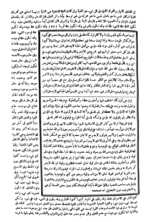 أَن صَاحب الْكَبِيرَة لَيْسَ مُؤمنا وَلَا كَافِرًا وَلكنه فَاسق (1) وَإِن كل من مَاتَ مصرا على كَبِيرَة من الْكَبَائِر فَلم يمت مُسلما وَإِذا لم يمت مُسلما فَهُوَ مخلد فِي النَّار أبدا وَإِن من مَاتَ وَلَا كَبِيرَة لَهُ أَو تَابَ عَن كبائره قبل مَوته فَإِنَّهُ مُؤمن من أهل الْجنَّة لَا يدْخل النَّار أصلا وَمِنْهُم من قَالَ بِأَن كل ذَنْب صَغِير أَو كَبِير فَهُوَ مخرج عَن الْإِيمَان وَالْإِسْلَام فَإِن مَاتَ عَلَيْهِ فَهُوَ غير مُسلم وَغير الْمُسلم مخلد فِي النَّار وَهَذِه مقالات الْخَوَارِج والمعتزلة إِلَّا أَن ابْن بكر أُخْت عبد الْوَاحِد بن زيد قَالَ فِي طَلْحَة وَالزُّبَيْر رَضِي الله عَنْهُمَا أَنَّهُمَا كَافِرَانِ من أهل الْجنَّة لِأَنَّهُمَا من أهل بدر وَقد قَالَ رَسُول الله صلى الله عَلَيْهِ وَسلم أَن الله تَعَالَى قَالَ لأهل بدر اعْمَلُوا مَا شِئْتُم فقد غفرت لكم قَالَ فَأهل بدران كفرُوا فمغفور لَهُم لأَنهم بِخِلَاف غَيرهم وَقَالَ بعض المرجئة (2) لَا تضر مَعَ الْإِسْلَام سَيِّئَة كَمَا لَا ينفع مَعَ الْكفْر حَسَنَة قَالُوا فَكل مُسلم وَلَو بلغ على مَعْصِيّة فَهُوَ من أهل الْجنَّة لَا يرى نَارا وَإِنَّمَا النَّار للْكفَّار وكلتا هَاتين الطائفيتين تقربان أحد أَلا يدْخل النَّار ثمَّ يخرج عَنْهَا بل من دخل النَّار فَهُوَ مخلد فِيهَا أبدا وَمن كَانَ من أهل الْجنَّة فَهُوَ لَا يدْخل النَّار