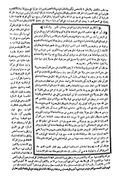 (قَالَ أَبُو مُحَمَّد) قَول من يُؤمن بالشفاعة أَنه لَا يجوز الِاقْتِصَار على بعض الْقُرْآن دون بعض وَلَا على بعض السّنَن دون بعض وَلَا على الْقُرْآن دون بَيَان رَسُول الله صلى الله عَلَيْهِ وَسلم الَّذِي قَالَ لَهُ ربه عز وَجل {لتبين للنَّاس مَا نزل إِلَيْهِم} وَقد نَص الله تَعَالَى على صِحَة الشَّفَاعَة فِي الْقُرْآن فَقَالَ تَعَالَى {لَا يملكُونَ الشَّفَاعَة إِلَّا من اتخذ عِنْد الرَّحْمَن عهدا} فَأوجب عز وَجل الشَّفَاعَة إِلَّا من اتخذ عِنْده عهدا بالشفاعة وَصحت بذلك الْأَخْبَار المتواترة المتناصرة بِنَقْل الكواف لَهَا قَالَ تَعَالَى {يَوْمئِذٍ لَا تَنْفَع الشَّفَاعَة إِلَّا من أذن لَهُ الرَّحْمَن وَرَضي لَهُ قولا} وَقَالَ تَعَالَى {لَا تَنْفَع الشَّفَاعَة إِلَّا من أذن لَهُ الرَّحْمَن وَرَضي لَهُ قولا} وَقَالَ تَعَالَى {وَلَا تَنْفَع الشَّفَاعَة عِنْده إِلَّا لمن أذن لَهُ} فنص تَعَالَى على أَن الشَّفَاعَة يَوْم الْقِيَامَة تَنْفَع عِنْده عز وَجل مِمَّن أذن لَهُ فِيهَا وَرَضي قَوْله وَلَا أحد من النَّاس أولى بذلك من مُحَمَّد صلى الله عَلَيْهِ وَسلم لِأَنَّهُ أفضل ولد آدم عَلَيْهِ السَّلَام وَقَالَ تَعَالَى {من ذَا الَّذِي يشفع عِنْده إِلَّا بِإِذْنِهِ} {وَكم من ملك فِي السَّمَاوَات لَا تغنى شفاعتهم شَيْئا إِلَّا من بعد أَن يَأْذَن الله لمن يَشَاء ويرضى} وَقَالَ تَعَالَى {وَلَا يملك الَّذين يدعونَ من دونه الشَّفَاعَة إِلَّا من شهد بِالْحَقِّ وهم يعلمُونَ} وَقَالَ تَعَالَى {مَا من شَفِيع إِلَّا من بعد إِذْنه} فقد صحت الشَّفَاعَة بِنَصّ الْقُرْآن الَّذِي يَأْتِيهِ الْبَاطِل من بَين يَدَيْهِ وَلَا من خَلفه فصح يَقِينا أَن الشَّفَاعَة الَّتِي أبطلها الله عز وَجل هِيَ غير الشَّفَاعَة الَّتِي أثبتها عز وَجل وَإِذ لَا شكّ فِي ذَلِك فالشفاعة الَّتِي أبطل عز وَجل هِيَ الشَّفَاعَة للْكفَّار الَّذين هم مخلدون فِي النَّار قَالَ تَعَالَى لَا يُخَفف عَنْهُم من عَذَابهَا وَلَا يقْضِي عَلَيْهِم فيموتوا نَعُوذ بِاللَّه مِنْهَا فَإذْ لَا شكّ فِيهِ فقد صَحَّ يَقِينا أَن الشَّفَاعَة الَّتِي أوجب الله عز وَجل لمن أذن لَهُ واتخذه عِنْده عهدا وَرَضي قَوْله فَإِنَّمَا هِيَ لمذنبي أهل الْإِسْلَام وَهَكَذَا جَاءَ الْخَبَر الثَّابِت