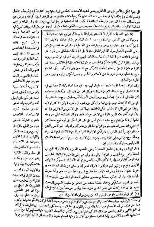 (قَالَ أَبُو مُحَمَّد) فَأَما الْأزَارِقَة فاحتجوا بقول الله تَعَالَى حاكياً عَن نوع نوح عَلَيْهِ السَّلَام أَنه قَالَ {رب لَا تذر على الأَرْض من الْكَافرين ديارًا أَنَّك إِن تذرهم يضلوا عِبَادك وَلَا يلدوا إِلَّا فَاجِرًا كفَّارًا} وَيَقُول رُوِيَ عَن رَسُول الله صلى الله عَلَيْهِ وَسلم أَن خَدِيجَة أم الْمُؤمنِينَ رَضِي الله عَنْهَا قَالَت يَا رَسُول الله أَيْن أطفالي مِنْك قَالَ فِي الْجنَّة قَالَت فأطفالي من غَيْرك قَالَ فِي النَّار فأعادت عَلَيْهِ فَقَالَ لَهَا إِن شِئْت أسمعتك تضاغيهم وَبِحَدِيث آخر فِيهِ الوائدة والموؤدة فِي النَّار وَقَالُوا إِن كَانُوا عنْدكُمْ فِي الْجنَّة فهم مُؤمنين لِأَنَّهُ لَا يدْخل الْجنَّة إِلَّا نفس مسلمة فَإِن كَانُوا مُؤمنين فيلزمكم أَن تدفنوا أَطْفَال الْمُشْركين مَعَ الْمُسلمين وَأَن لَا تتركوه يلْتَزم إِذا بلغ دين أَبِيه فَتكون ردة وخروجاً عَن الْإِسْلَام وَالْكفْر وَيَنْبَغِي لكم أَن ترثوه وتورثوه من أَقَاربه من الْمُسلمين (قَالَ أَبُو مُحَمَّد) هَذَا كل مَا احتجرا بِهِ مَا يعلم لَهُم حجَّة غير هَذَا أصلا وَكله لَا حجَّة لَهُم فِيهِ الْبَتَّةَ أما قَول نوح عَلَيْهِ السَّلَام فَلم يقل ذَلِك على كفار قومه خَاصَّة لِأَن الله تَعَالَى قَالَ لَهُ {إِنَّه لن يُؤمن من قَوْمك إِلَّا من قد آمن} فأيقن نوح عَلَيْهِ السَّلَام بِهَذَا الْوَحْي أَنه لَا يحدث فيهم مُؤمن أبدا وَإِن كل من ولدوه إِن ولدوه لم يكن إِلَّا كَافِرًا وَلَا بُد وَهَذَا هُوَ نَص الْآيَة لِأَنَّهُ تَعَالَى حُكيَ أَنه قَالَ {رب لَا تذر على الأَرْض من الْكَافرين ديارًا} وَإِنَّمَا أَرَادَ كفار وقته الَّذين كَانُوا على الأَرْض حِينَئِذٍ فَقَط وَلَو كَانَ للأزارقة أدنى علم وَفقه لعلموا أَن هَذَا من كَلَام نوح عَلَيْهِ السَّلَام لَيْسَ على كل كَافِر لَكِن على قوم نوح خَاصَّة لِأَن إِبْرَاهِيم ومحمداً صلى الله عَلَيْهِمَا وَسلم كَانَ أبواهما كَافِرين مُشْرِكين وَقد ولدا خير الْإِنْس وَالْجِنّ قد من الْمُؤمنِينَ وأكمل النَّاس إِيمَانًا وَلَكِن الْأزَارِقَة كَانُوا أعراباً جُهَّالًا كالأنعام بل هم أضلّ سَبِيلا وَهَكَذَا صَحَّ عَن النَّبِي صلى الله عَلَيْهِ وَسلم من طَرِيق الْأسود بن سريع التَّمِيمِي أَنه عَلَيْهِ السَّلَام قَالَ أَو لَيْسَ خياركم أَوْلَاد الْمُشْركين