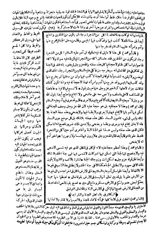 (قَالَ أَبُو مُحَمَّد) وَهَذَا أعظم حجَّة عَلَيْهِ لِأَنَّهُ لَو كَانَ فِي الْمَكَان الَّذِي هُوَ فِيهِ شمس لَا ضحى فِيهِ وَلَا بُد فصح أَن الْجنَّة الَّتِي أسكن فِيهَا آدم كَانَت لَا شمس فِيهَا فَهِيَ جنَّة الْخلد بِلَا شكّ وَأَيْضًا فَإِن قَوْله عز وَجل {اسكن أَنْت وزوجك الْجنَّة} إِشَارَة بِالْألف وَاللَّام وَلَا يكون ذَلِك إِلَّا على مَعْهُود وَلَا تَنْطَلِق الْجنَّة هَكَذَا إِلَّا على جنَّة الْخلد وَلَا ينْطَلق هَذَا الِاسْم على غَيرهَا إِلَّا بِالْإِضَافَة وَأَيْضًا فَلَو أسكن آدم عَلَيْهِ السَّلَام جنَّة فِي الأَرْض لما كَانَ فِي إِخْرَاجه مِنْهَا إِلَى غَيرهَا من الأَرْض عُقُوبَة بل قد بَين تَعَالَى أَنَّهَا لَيست فِي الأَرْض بقوله تَعَالَى {اهبطا مِنْهَا جَمِيعًا بَعْضكُم لبَعض عَدو} {وَلكم فِي الأَرْض مُسْتَقر ومتاع إِلَى حِين} فصح يَقِينا بِالنَّصِّ أَنه قد أهبط من الْجنَّة إِلَى الأَرْض فصح أَنَّهَا لم تكن فِي الأَرْض الْبَتَّةَ وَبِاللَّهِ تَعَالَى التَّوْفِيق
