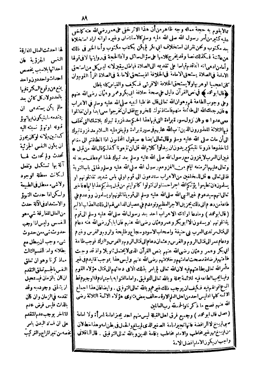 (قَالَ أَبُو مُحَمَّد) فِي نَص الْقُرْآن دَلِيل على صِحَة خلَافَة أبي بكر وَعمر وَعُثْمَان رَضِي الله عَنْهُم وعَلى وجوب الطَّاعَة لَهُم وَهُوَ أَن الله تَعَالَى قَالَ مُخَاطبا لنَبيه صلى الله عَلَيْهِ وَسلم فِي الْأَعْرَاب {فَإِن رجعك الله إِلَى طَائِفَة مِنْهُم فاستأذنوك لِلْخُرُوجِ فَقل لن تخْرجُوا معي أبدا وَلنْ تقاتلوا معي عدوا} وَكَانَ نزُول سُورَة بَرَاءَة الَّتِي فِيهَا هَذَا الحكم بعد غَزْوَة تَبُوك بِلَا شكّ الَّتِي لَا تخلف فِيهَا الثَّلَاثَة المعذورون الَّذين تَابَ الله عَلَيْهِم فِي سُورَة بَرَاءَة وَلم يغز عَلَيْهِ السَّلَام بعد غَزْوَة تَبُوك إِلَى أَن مَاتَ صلى الله عَلَيْهِ وَسلم وَقَالَ تَعَالَى أَيْضا {سَيَقُولُ الْمُخَلفُونَ إِذا انطلقتم إِلَى مَغَانِم لتأخذوها ذرونا نتبعكم يُرِيدُونَ أَن يبدلوا كَلَام الله قل لن تتبعونا كذلكم قَالَ الله من قبل} فَبين أَن الْعَرَب لَا يغزون مَعَ رَسُول الله صلى الله عَلَيْهِ وَسلم بعد تَبُوك لهَذَا ثمَّ عطف سُبْحَانَهُ وَتَعَالَى عَلَيْهِم أثر مَنعه إيَّاهُم من الْغَزْو مَعَ رَسُول الله صلى الله عَلَيْهِ وَسلم وغلق بَاب التَّوْبَة فَقَالَ تَعَالَى {قل للمخلفين من الْأَعْرَاب ستدعون إِلَى قوم أولي بَأْس شَدِيد تقاتلونهم أَو يسلمُونَ فَإِن تطيعوا يُؤْتكُم الله أجرا حسنا وَإِن تَتَوَلَّوْا كَمَا توليتم من قبل يعذبكم عذَابا أَلِيمًا} فَأخْبر تَعَالَى أَنهم سيدعوهم غير النَّبِي صلى الله عَلَيْهِ وَسلم إِلَى قوم يقاتلونهم أَو يسلمُونَ وَوَعدهمْ على طَاعَة من دعاهم إِلَى ذَلِك بجزيل الْأجر الْعَظِيم وتوعدهم على عصيان الدَّاعِي لَهُم إِلَى ذَلِك الْعَذَاب الْأَلِيم