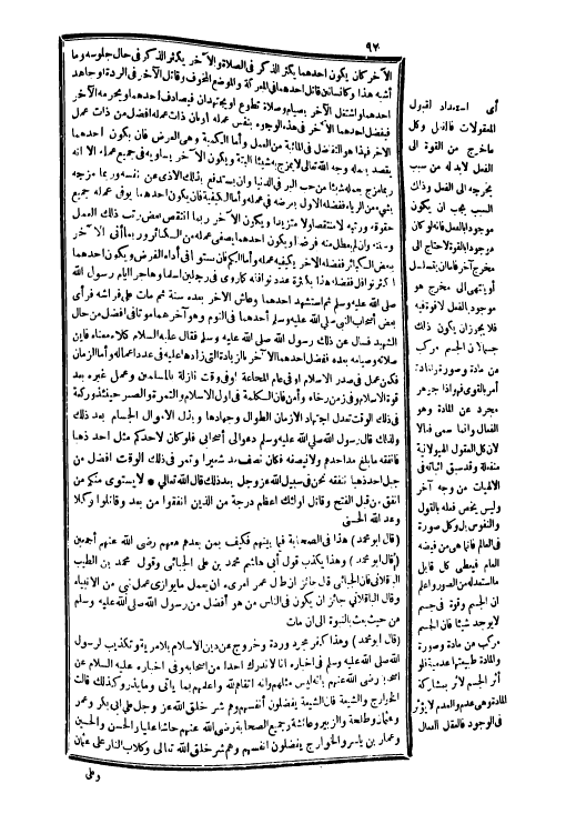 الآخر كَأَن يكون أَحدهمَا يكثر الذّكر فِي الصَّلَاة وَالْآخر يكثر الذّكر فِي حَال جُلُوسه وَمَا أشبه هَذَا وكإنسانين قَاتل أَحدهمَا فِي المعركة والموضع الْمخوف وَقَاتل الآخر فِي الرِّدَّة أَو جَاهد أَحدهمَا واشتغل الآخر بصيام وَصَلَاة تطوع أَو يجتهدان فيصادف أَحدهمَا ويحرمه الآخر فيفضل أَحدهمَا الآخر فِي هَذِه الْوُجُوه بِنَفس عمله أَو بَان ذَات عمله أفضل من ذَات عمل الآخر فَهَذَا هُوَ التَّفَاضُل فِي المائية من الْعَمَل وَأما الكمية وَهِي الْعرض فَإِن يكون أَحدهمَا يقْصد بِعَمَلِهِ وَجه الله تَعَالَى لَا يمزج بِهِ شَيْئا الْبَتَّةَ وَيكون الآخر يُسَاوِيه فِي جَمِيع عمله إِلَّا أَنه رُبمَا مزج بِعَمَلِهِ شَيْئا من حب الْبر فِي الدُّنْيَا وَأَن يستدفع بذلك الْأَذَى عَن نَفسه وَرُبمَا مزجه بِشَيْء من الرِّيَاء ففضله الأول بعرضه فِي عمله وَأما الْكَيْفِيَّة فَإِن يكون أَحدهمَا يُوفي عمله جَمِيع حُقُوقه ورتبه لَا منتقصاً وَلَا متزيداً وَيكون الآخر رُبمَا انْتقصَ بعض رتب ذَلِك الْعَمَل وسنته وَإِن لم يعطل مِنْهُ فرضا أَو يكون أَحدهمَا يصفى يصفى عمله من الْكَبَائِر وَرُبمَا بِمَا أُتِي الآخر بِبَعْض الْكَبَائِر ففضله الآخر بكيفية عمله وَأما لكم فَإِن يستوا فِي أَدَاء الْفَرْض وَيكون أَحدهمَا أَكثر نوافل ففضله هَذَا بِكَثْرَة عدد نوافله كَمَا رُوِيَ فِي رجلَيْنِ أسلما وهاجرا أَيَّام رَسُول الله صلى الله عَلَيْهِ وَسلم ثمَّ اسْتشْهد أَحدهمَا وعاش الآخر بعده سنة ثمَّ مَاتَ على فرَاشه فَرَأى بعض أَصْحَاب النَّبِي صلى الله عَلَيْهِ وَسلم أَحدهمَا فِي النّوم وَهُوَ آخرهما موتا فِي أفضل من حَال الشَّهِيد فَسَأَلَ عَن ذَلِك رَسُول الله صلى الله عَلَيْهِ وَسلم فَقَالَ عَلَيْهِ السَّلَام كَلَام مَعْنَاهُ فَأَيْنَ صلَاته وصيامه بعده ففضل أَحدهمَا الآخر بِالزِّيَادَةِ الَّتِي زَادهَا عَلَيْهِ فِي عدد أَعماله وَأما الزَّمَان فكمن عمل فِي صدر الْإِسْلَام أَو فِي عَام المجاعة أَو فِي وَقت نازلة بِالْمُسْلِمين وَعمل غَيره بعد قُوَّة الْإِسْلَام وَفِي زمن رخاء وَأمن فَإِن الْكَلِمَة فِي أول الْإِسْلَام وَالتَّمْرَة وَالصَّبْر حِينَئِذٍ وركعة فِي لَك الْوَقْت تعدل اجْتِهَاد الْأَزْمَان الطوَال وجهادها وبذل الْأَمْوَال الجسام بعد ذَلِك وَلذَلِك قَالَ رَسُول الله صلى الله عَلَيْهِ وَسلم دعوا إِلَيّ أَصْحَابِي فَلَو كَانَ لأحدكم مثل أحد ذَهَبا فأنفقه مَا بلغ مد أحدهم وَلَا نيصفه فَكَانَ نصف مد شَعِيرًا وتمر فِي ذَلِك الْوَقْت أفضل من جبل أحد ذَهَبا ننفقه نَحن فِي سَبِيل الله عز وَجل بعد ذَلِك قَالَ الله تَعَالَى {لَا يَسْتَوِي مِنْكُم من أنْفق من قبل الْفَتْح وَقَاتل أُولَئِكَ أعظم دَرَجَة من الَّذين أَنْفقُوا من بعد وقاتلوا وكلا وعد الله الْحسنى}