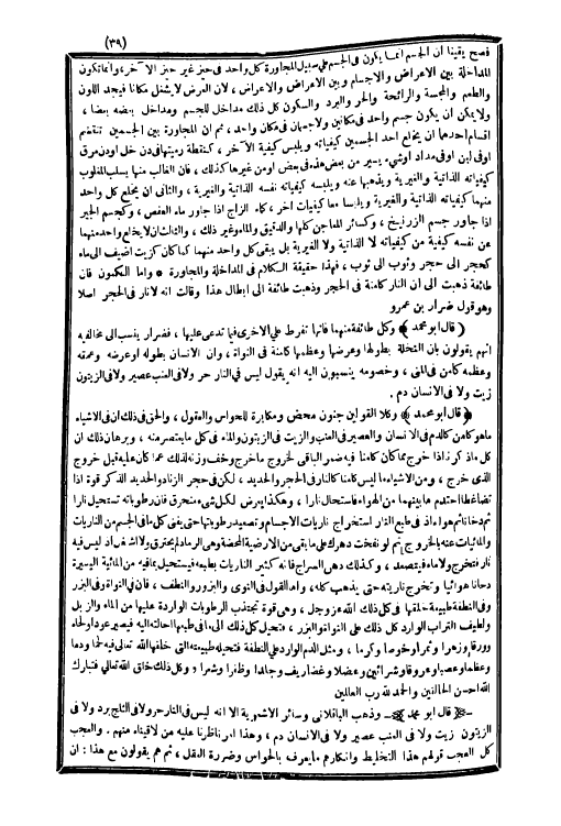 فصح يَقِينا أَن الْجِسْم إِنَّمَا يكون فِي الْجِسْم على سَبِيل الْمُجَاورَة كل وَاحِد فِي حيّز غير حيّز الآخر وَإِنَّمَا تكون المداخلة بَين الْأَعْرَاض والأجسام وَبَين الْأَعْرَاض والأعراض لِأَن الْعرض لَا يشغل مَكَانا فيجد اللَّوْن والطعم والمجسة والرائحة وَالْحر وَالْبرد والسكون كل ذَلِك مدَاخِل للجسم ومداخل بعضه بَعْضًا وَلَا يُمكن أَن يكون جسم وَاحِد فِي مكانين وَلَا جسمان فِي مَكَان وَاحِد ثمَّ أَن الْمُجَاورَة بَين الجسمين تَنْقَسِم أَقسَام أَحدهمَا أَن يخلع أحد الجسمين كيفياته ويلبس كَيْفيَّة الآخر كنقطة رميتها فِي دن خل أَو دون مرق أَو فِي لبن أَو فِي مداد أَو شَيْء يسير من بعض هَذِه فِي بعض أَو من غَيرهَا كَذَلِك فَإِن الْغَالِب مِنْهَا يسلب المغلوب كيفياته الذاتية والغيرية ويذهبها عَنهُ ويلبسه كيفياته نَفسه الذاتية والغيرية وَالثَّانِي أَن يخلع كل وَاحِد مِنْهُمَا كيفياته الذاتية والغيرية ويلبسا مَعًا كيفيات أخر كَمَاء الزاج إِذا جَاوز المَاء العفص وكجسم الجير إِذا جاور جسم الزرنيخ وكسائر المعاجن كلهَا والدقيق وَالْمَاء وَغير ذَلِك وَالثَّالِث أَن لَا يخلع وَاحِد مِنْهُمَا عَن نَفسه كَيْفيَّة من كيفياته لَا الذاتية وَلَا الغيرية بل يبْقى كل وَاحِد مِنْهُمَا كَمَا كَانَ كزيت أضيف إِلَى مَاء كحجر إِلَى حجر وثوب إِلَى ثوب فَهَذَا حَقِيقَة الْكَلَام فِي المداخلة والمجاورة وَأما الكمون فَإِن طَائِفَة ذهبت إِلَى أَن النَّار كامنة فِي الْحجر وَذَهَبت طَائِفَة إِلَى إبِْطَال هَذَا وَقَالَت أَنه لَا نَار فِي الْحجر أصلا وَهُوَ قَول ضرار بن عَمْرو