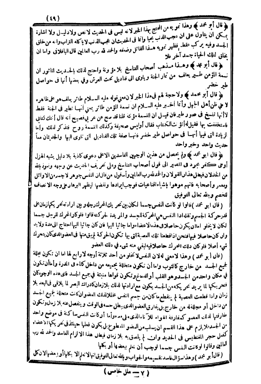 قَالَ أَبُو مُحَمَّد وَلم يحصل من هذَيْن الْوَجْهَيْنِ الفاسدين إِلَّا على دَعْوَى كَاذِبَة بِلَا دَلِيل يشبه الْهزْل أَو على كفر مُجَرّد فِي الْمصير إِلَى قَول أَصْحَاب التناسخ وعَلى تَحْرِيف الحَدِيث عَن وَجهه ونعوذ بِاللَّه من الخذلان فَبَطل هَذَانِ الْقَوْلَانِ وَالْحَمْد لله رب الْعَالمين وَأما قَول من قَالَ أَن النَّفس جَوْهَر لَا جسم من الْأَوَائِل وَمعمر وَأَصْحَابه فَإِنَّهُم موهوا بأَشْيَاء إقناعيات فَوَجَبَ إيرادها ونقضها ليظْهر الْبُرْهَان على وَجه الْإِنْصَاف للخصم وَبِاللَّهِ تَعَالَى التَّوْفِيق